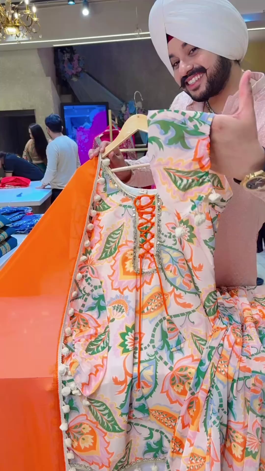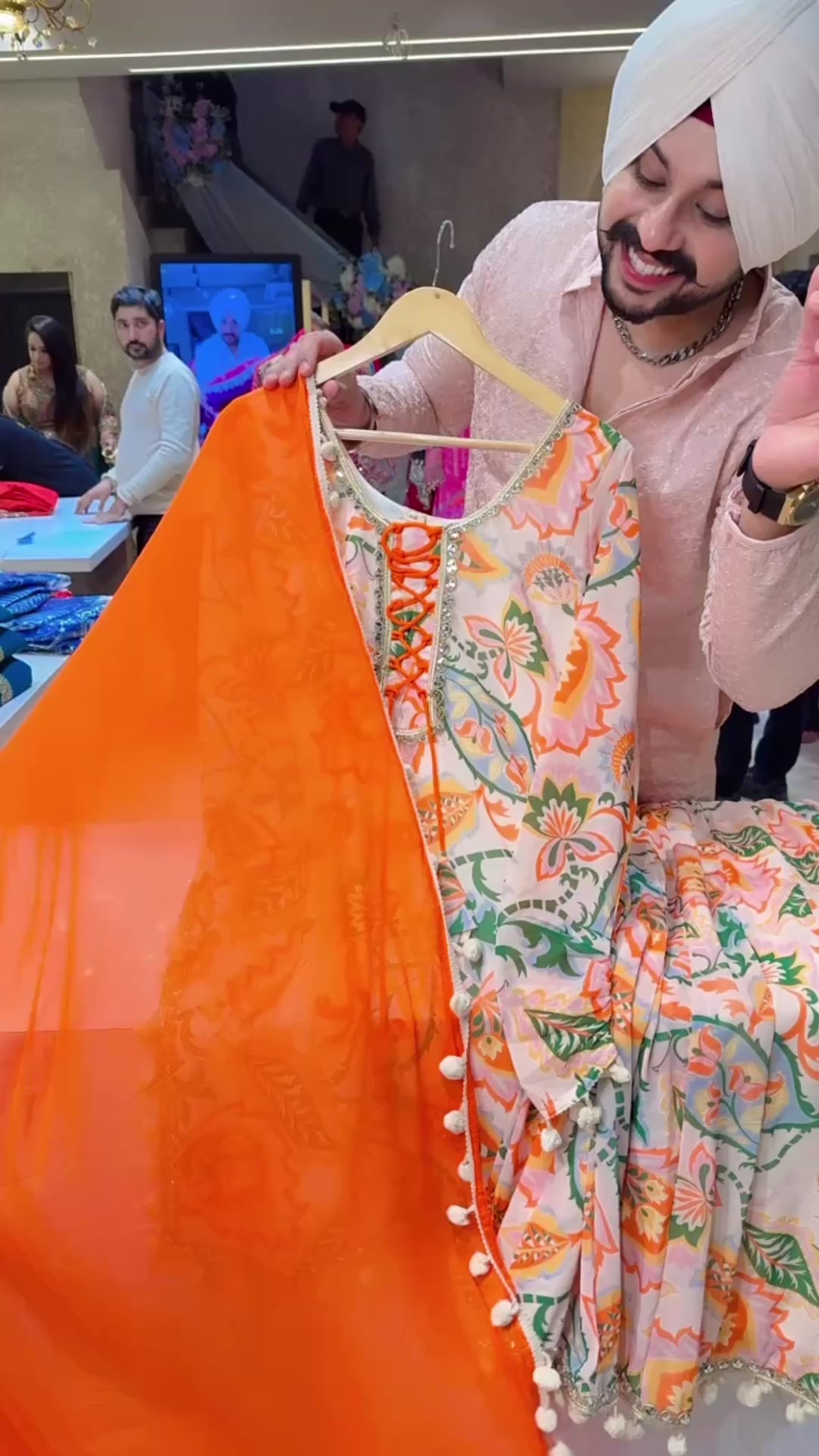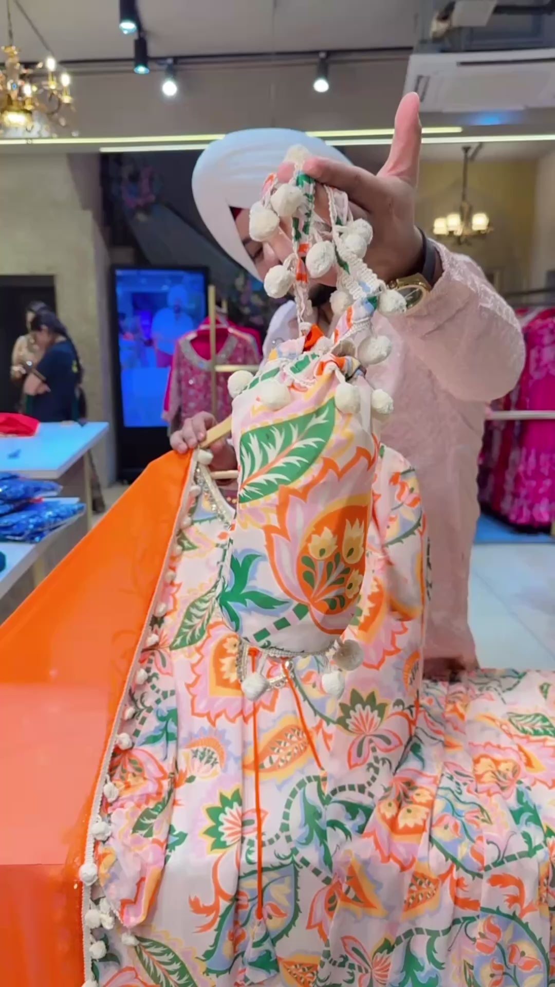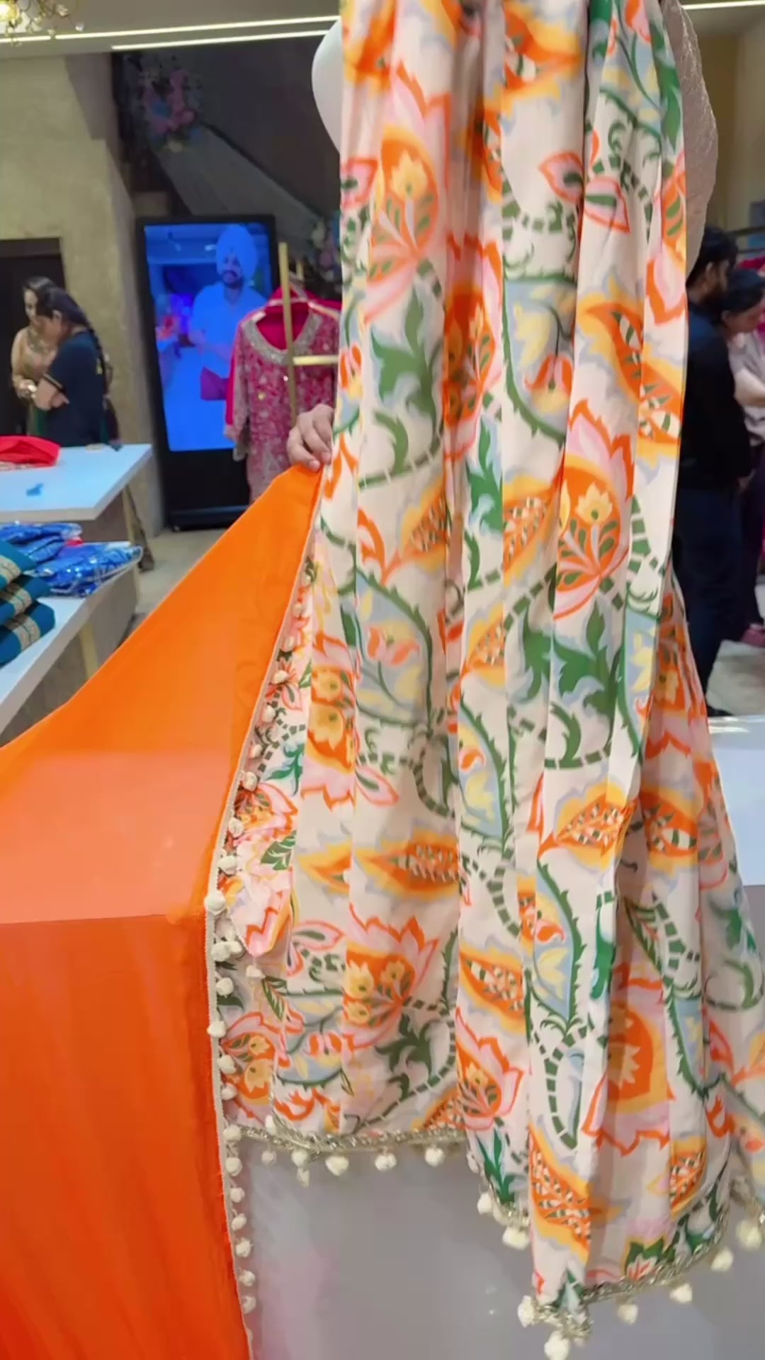 Light Beige & Orange Chiffon Full Flair Pom-Pom Sharara Suit with Pom-Pom Dupppata & Cute Potli