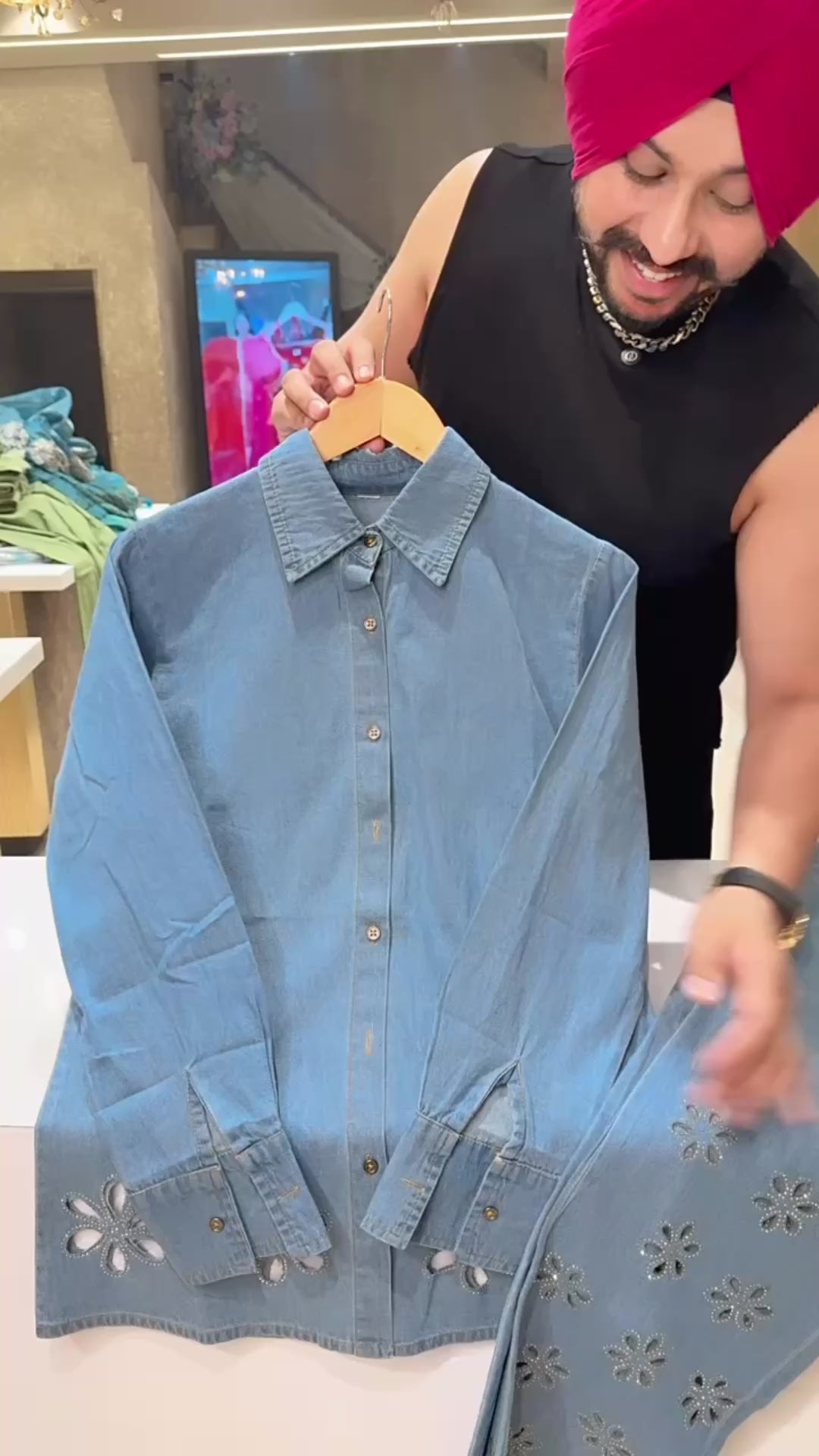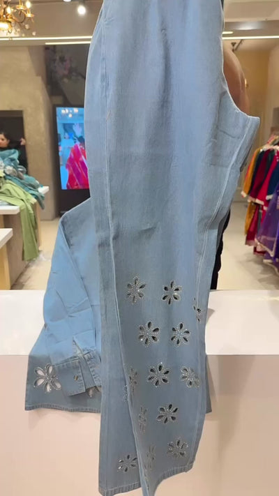 Light Blue Soft Denim Designer Coord sets with Swarovski & Cut Work on it