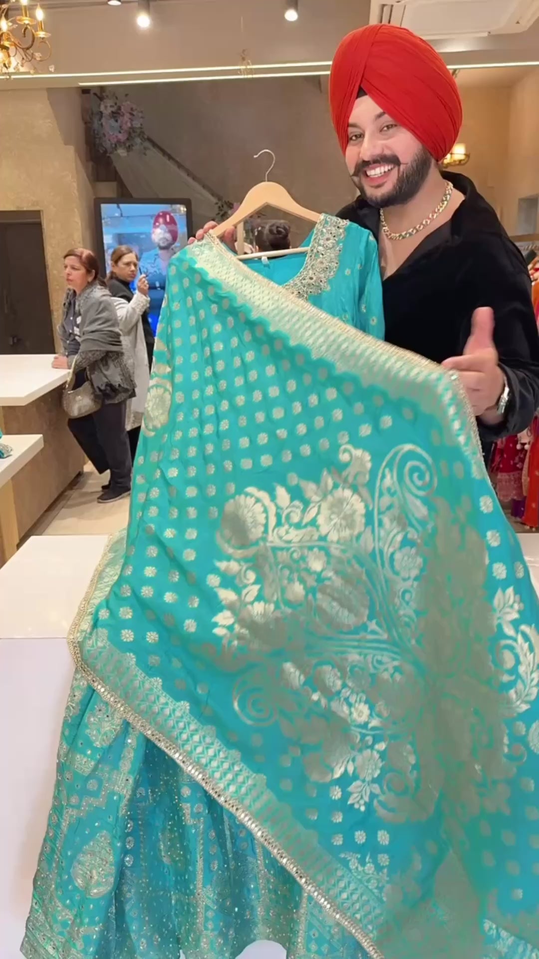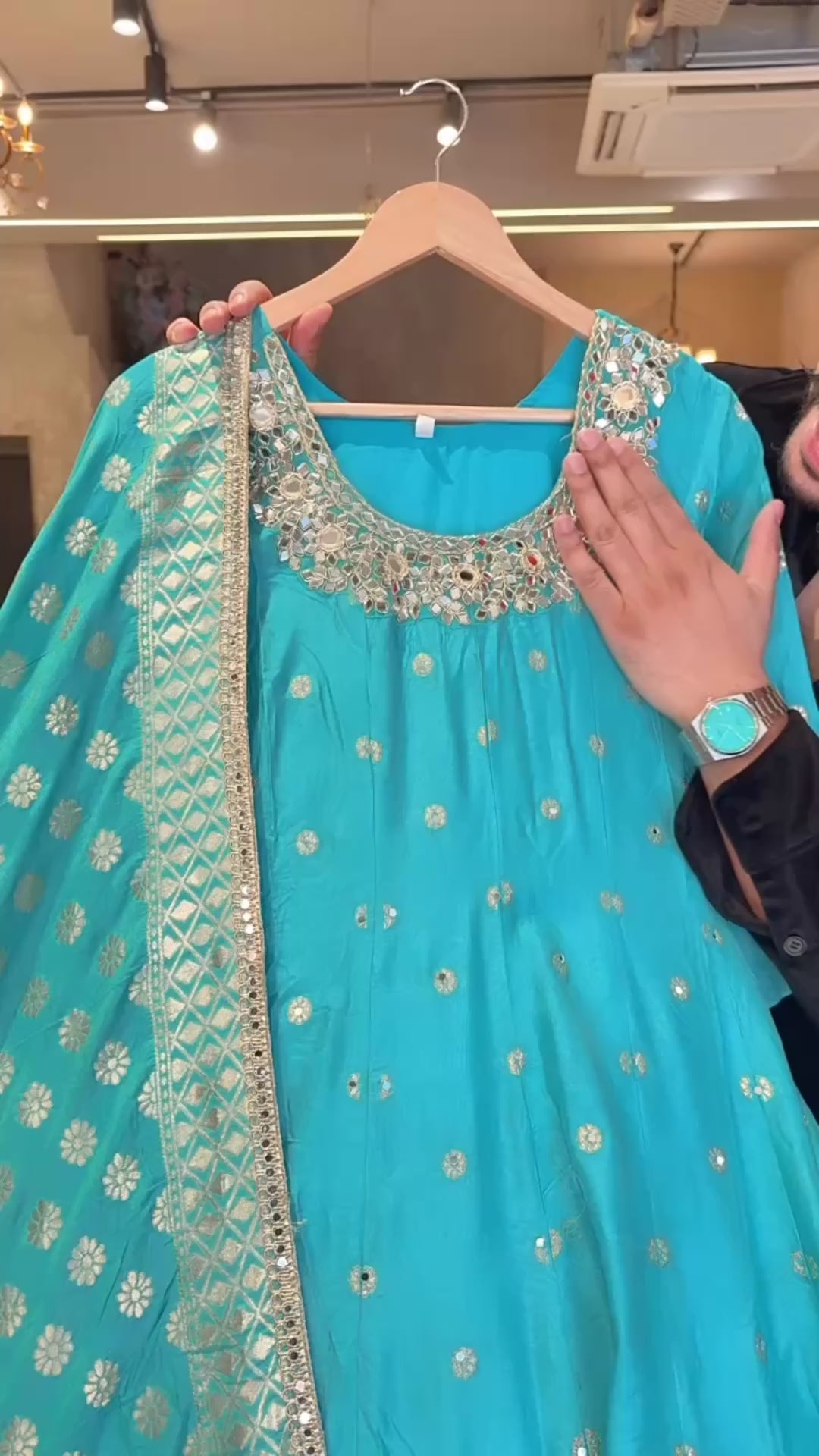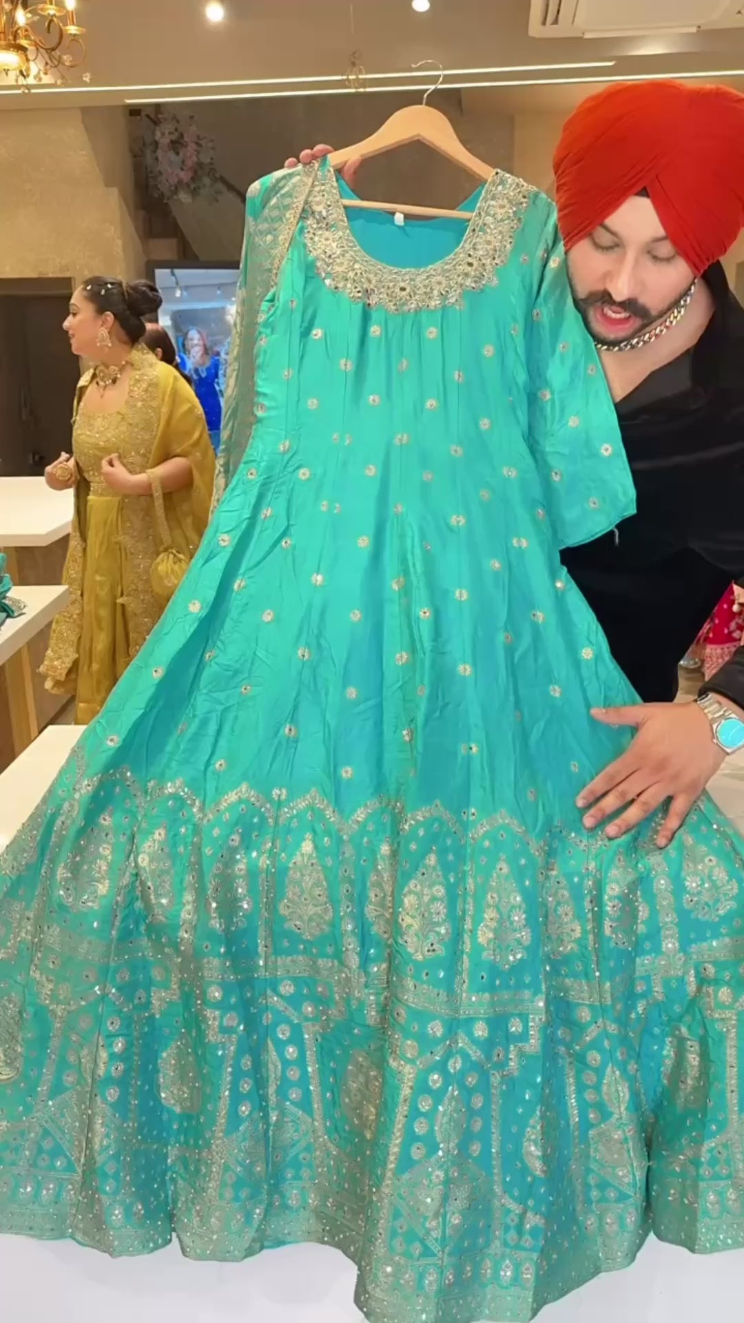 Light Firozi Soft Silk Full Flair Hand Embroidered & Mirror Pasting Anarkali Gown With Heavy Banarasi Border & Duppata
