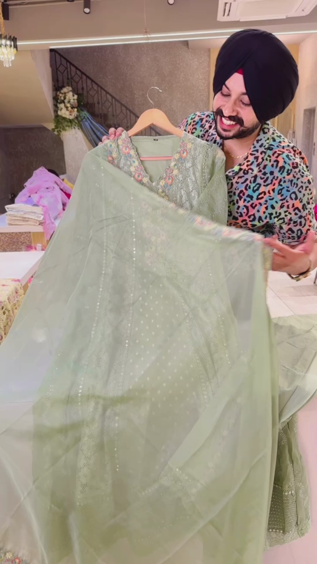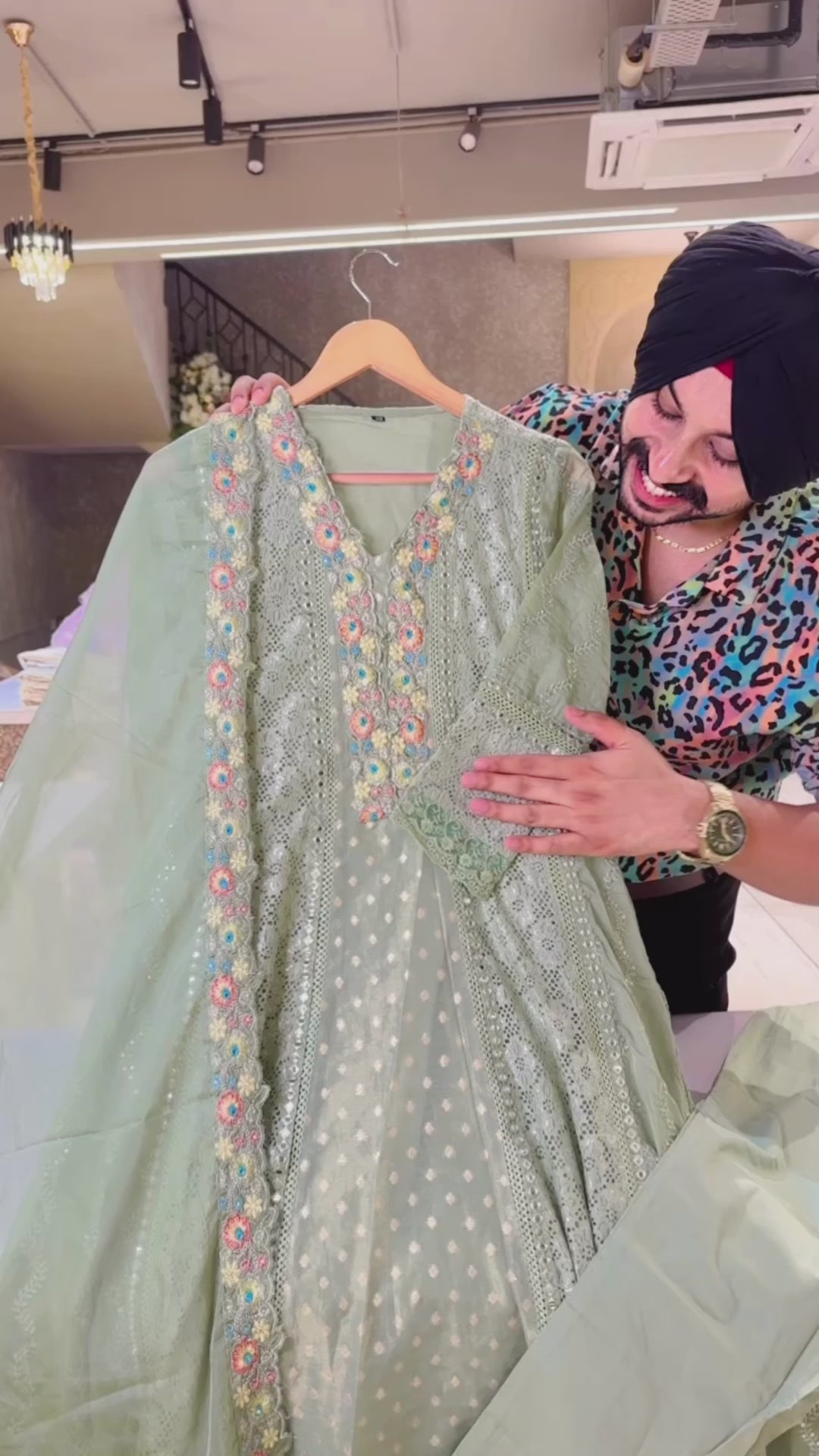 Light green Embroidered & crochet lace Anarkli Suit with Organza Duppata