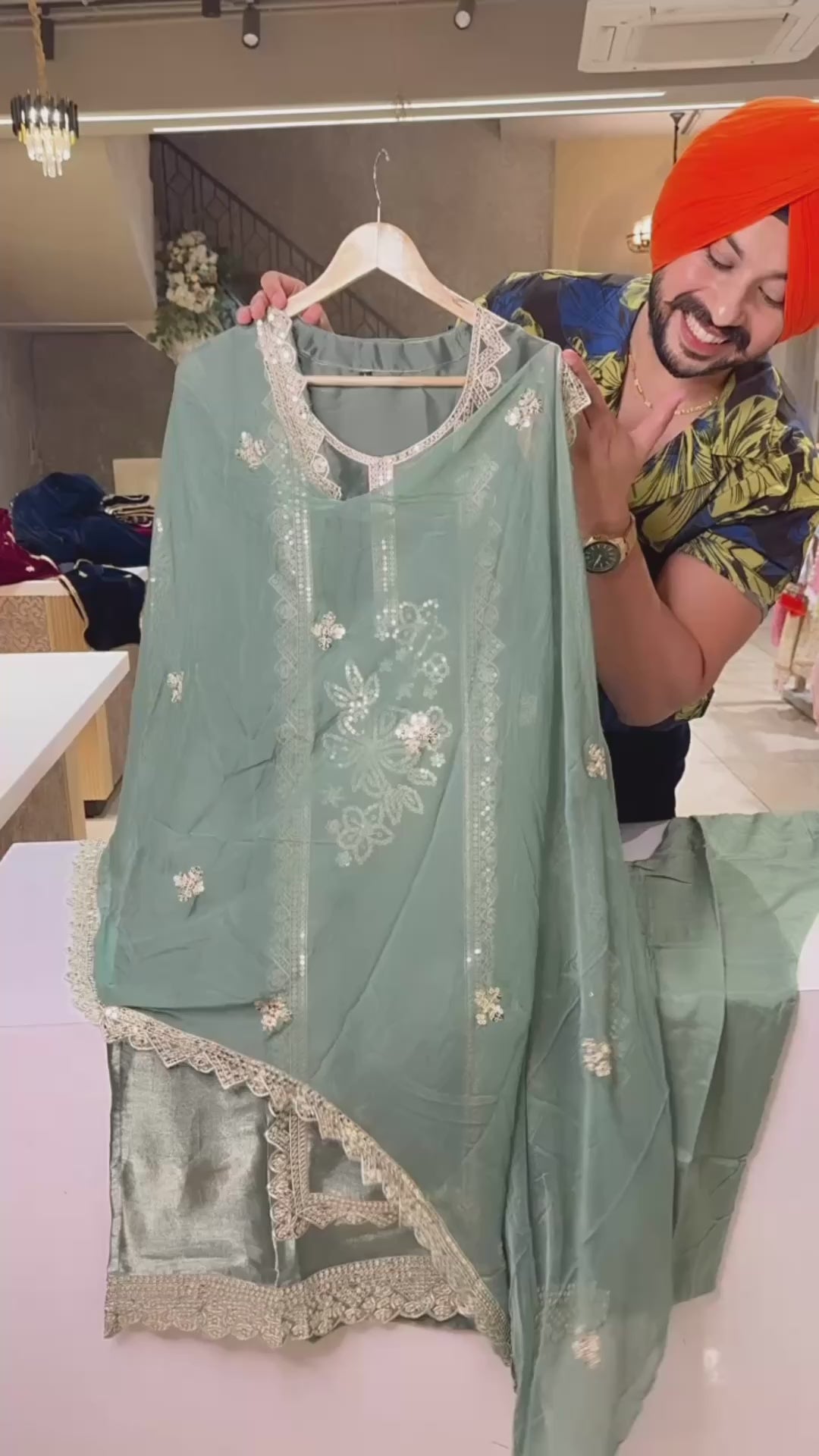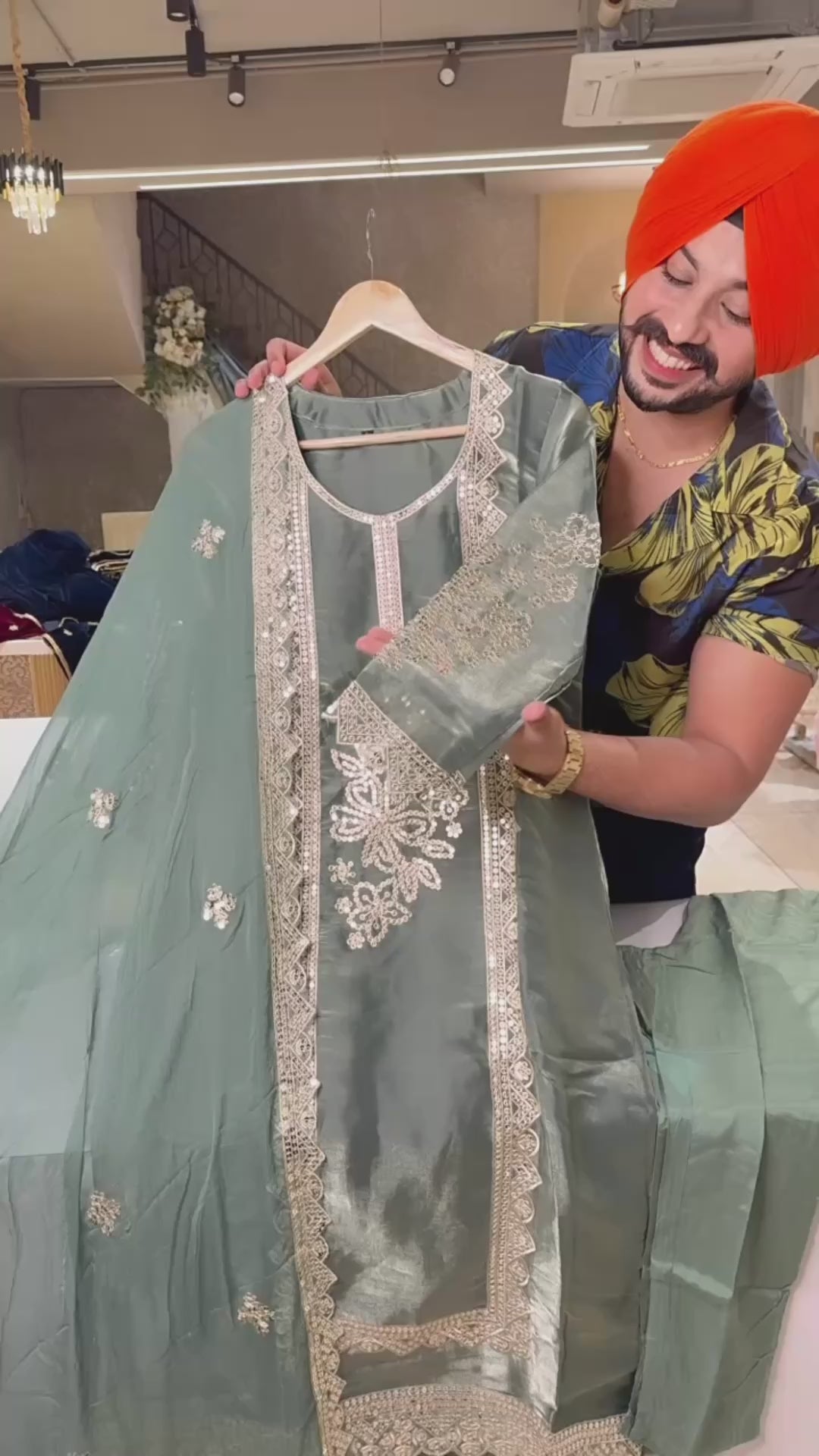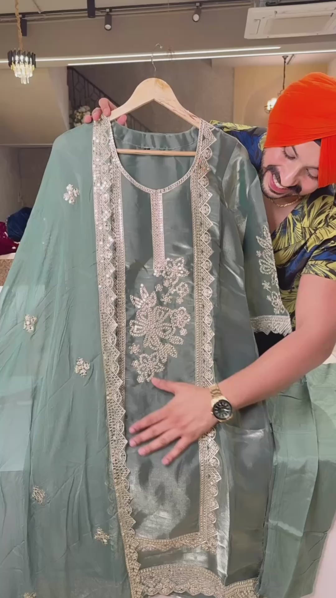 Olive Green Glass Shimmer Tissue Fully Embroidered Straight Suit with Embroidered Chiffon Duppata