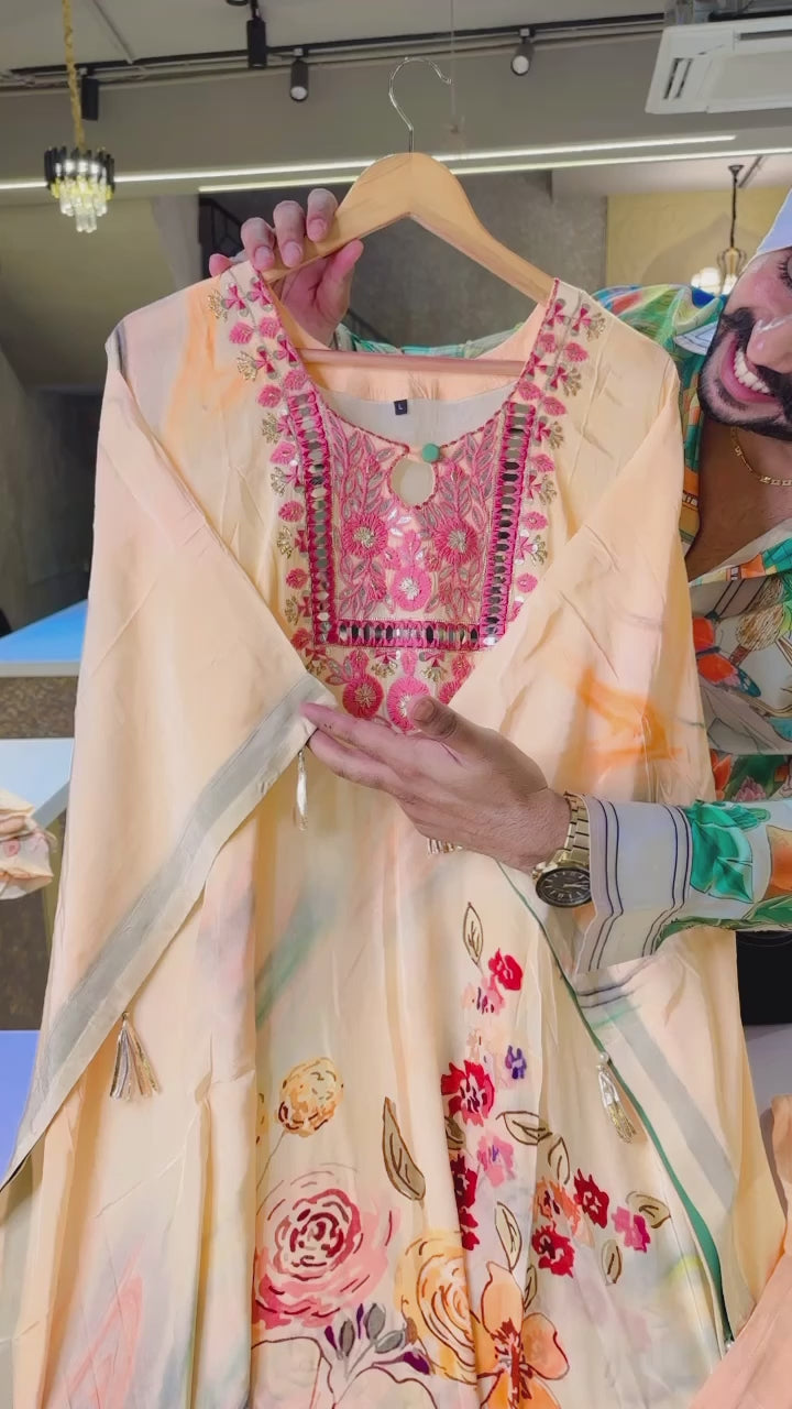 Light peach Crepe Kaftan Coord set with Beautiful Mirror & gotta Patti Hand work on neck