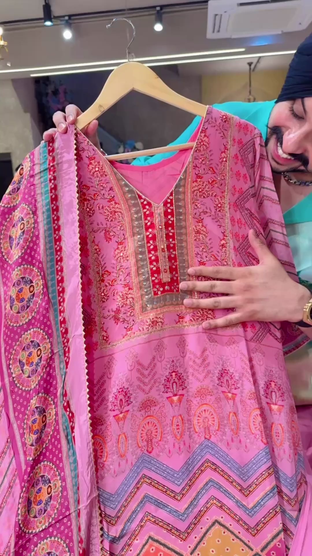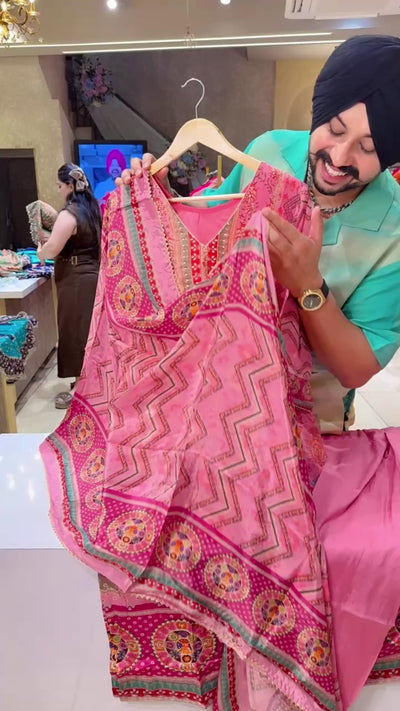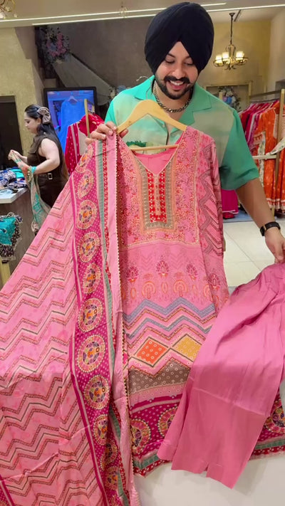 Light Pink Crepe digital Print party Wear Suit with Hand embroidery Work on neck