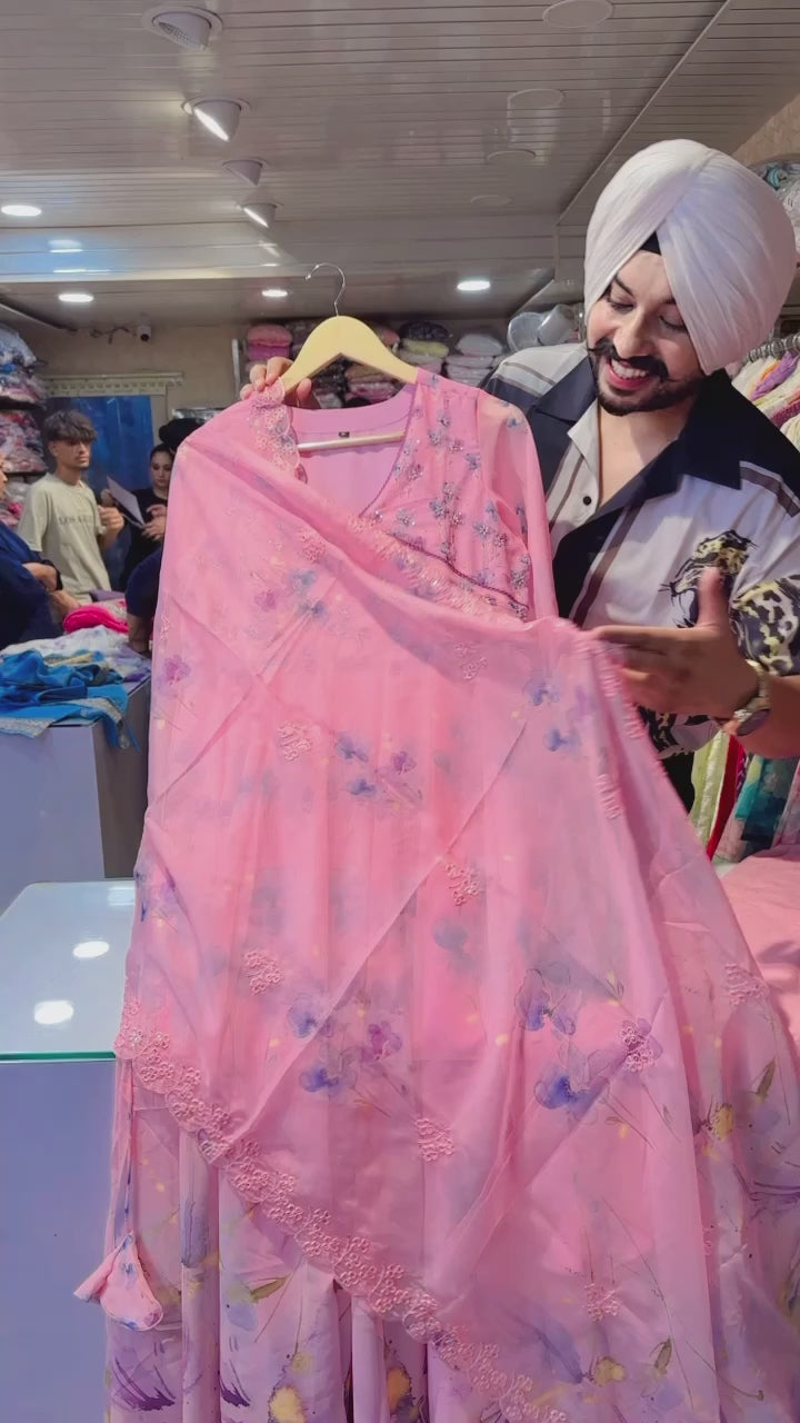 Light Pink Georgette Angrakha Anarkali suit with Beautiful Hand embroidery on neck