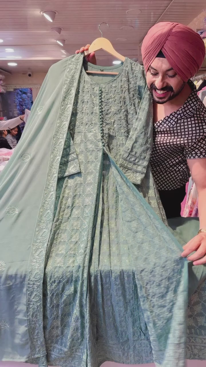 Light Seagreen Front & side slit Georgette Fully Embroidered suit with Beautiful Duppata