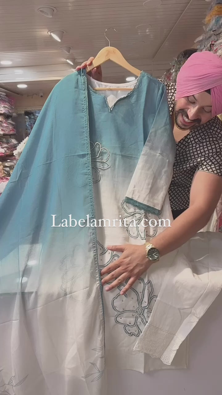 Linen Cotton light teel & moon white Suit with Beautiful hand work on it