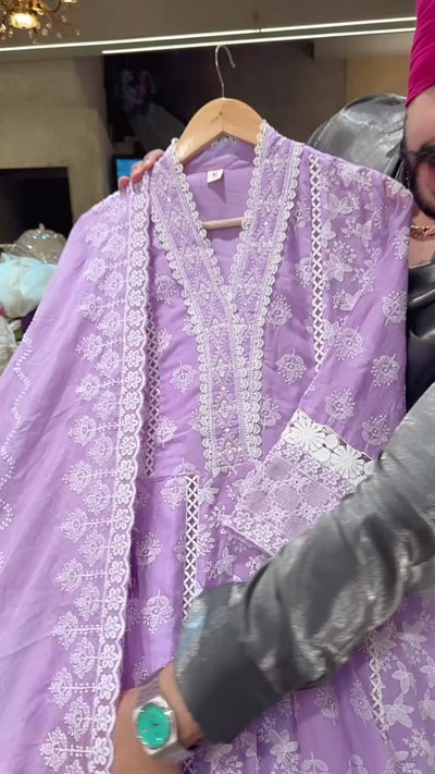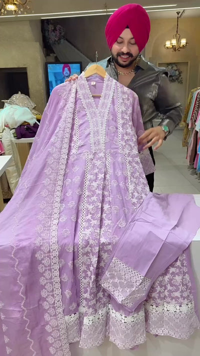 Lilac Mal Cotton Fully Embroidered Anarkali Suut with Embroidered Mal Cotton Duppata