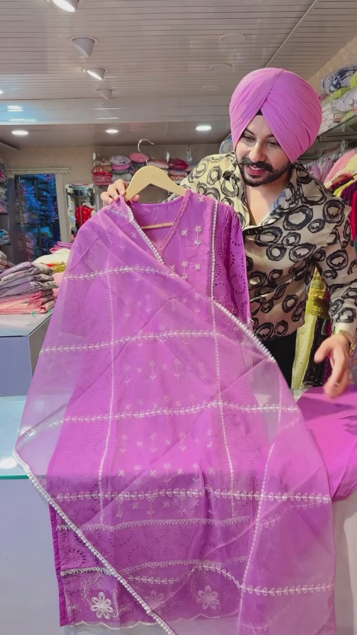 Lilac pure Cotton Fully Hand Embroidered Straight Suit with beautiful Organza Duppata