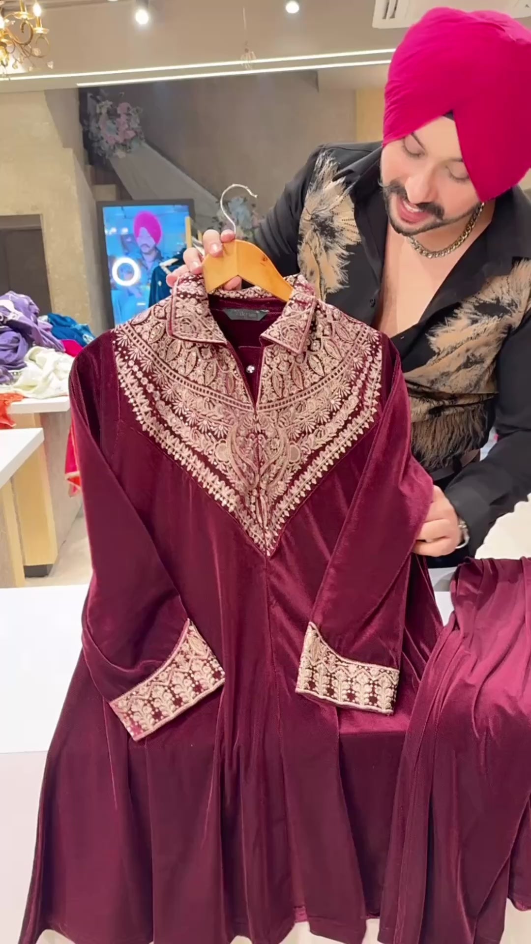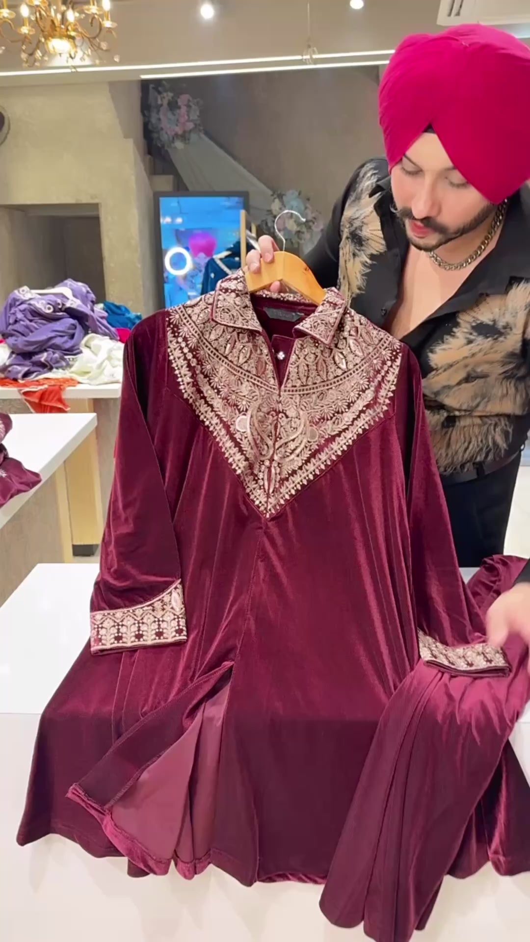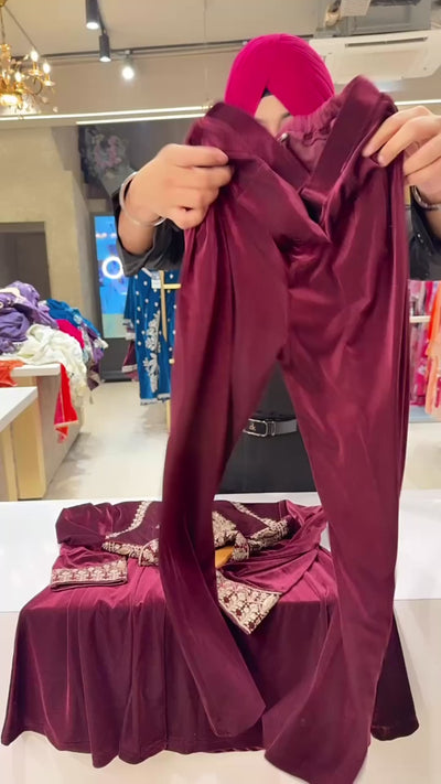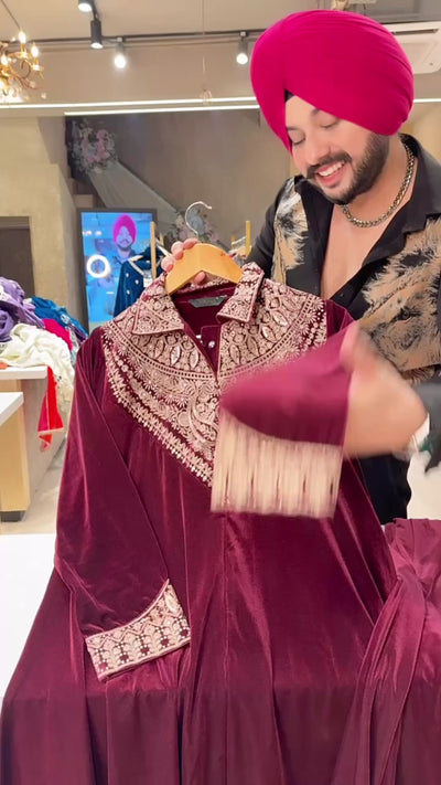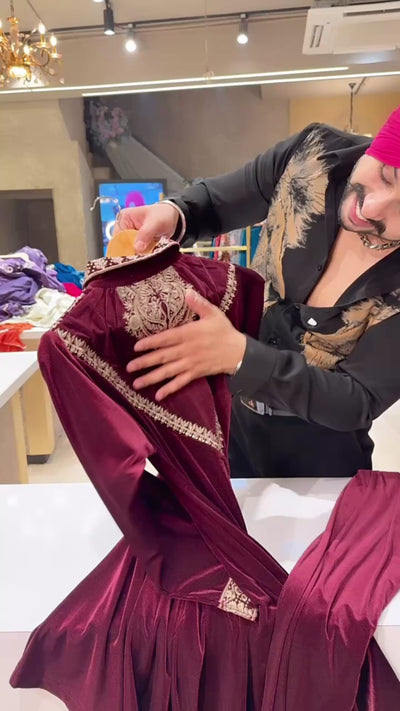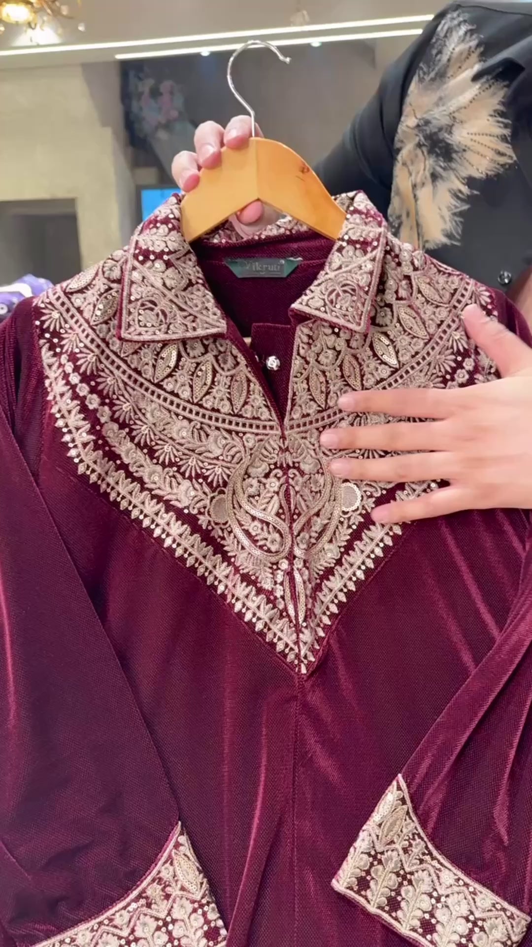 Maroon Strechable Velvet Heavy front & Back embroidered Designer Paplum Front Slit Coord set