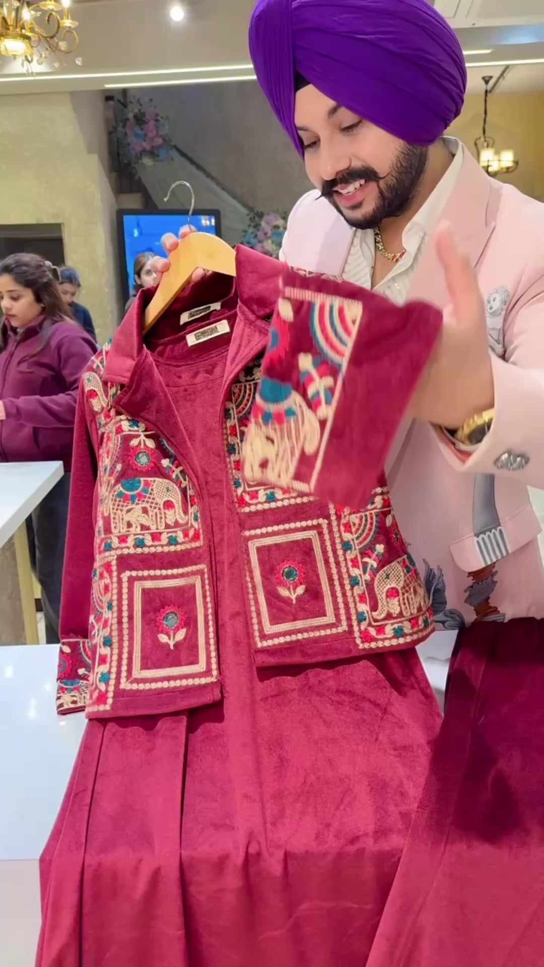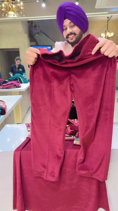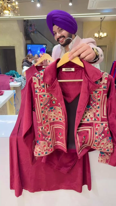 Maroon Velvet A-line Long Length Coord set with Collar Neck Embroidered Short Jacket