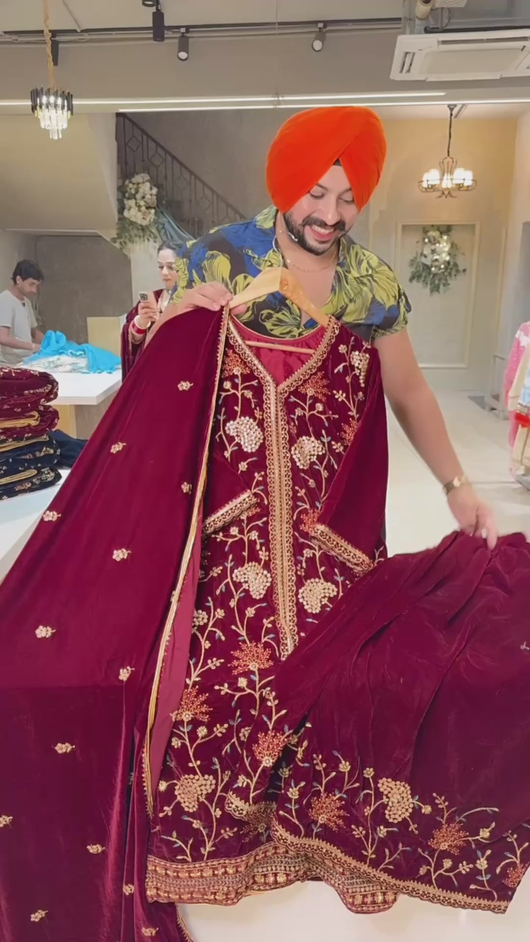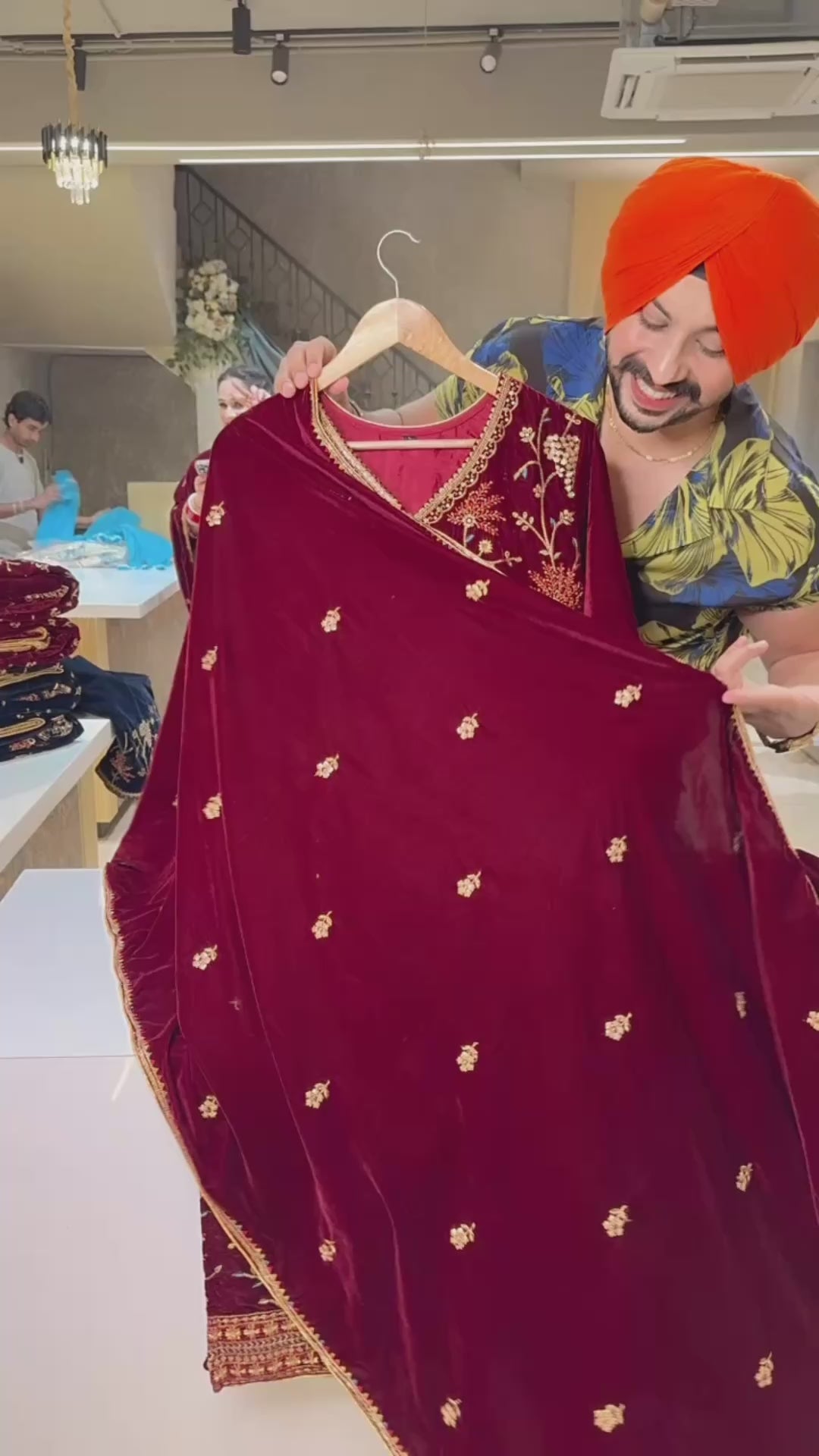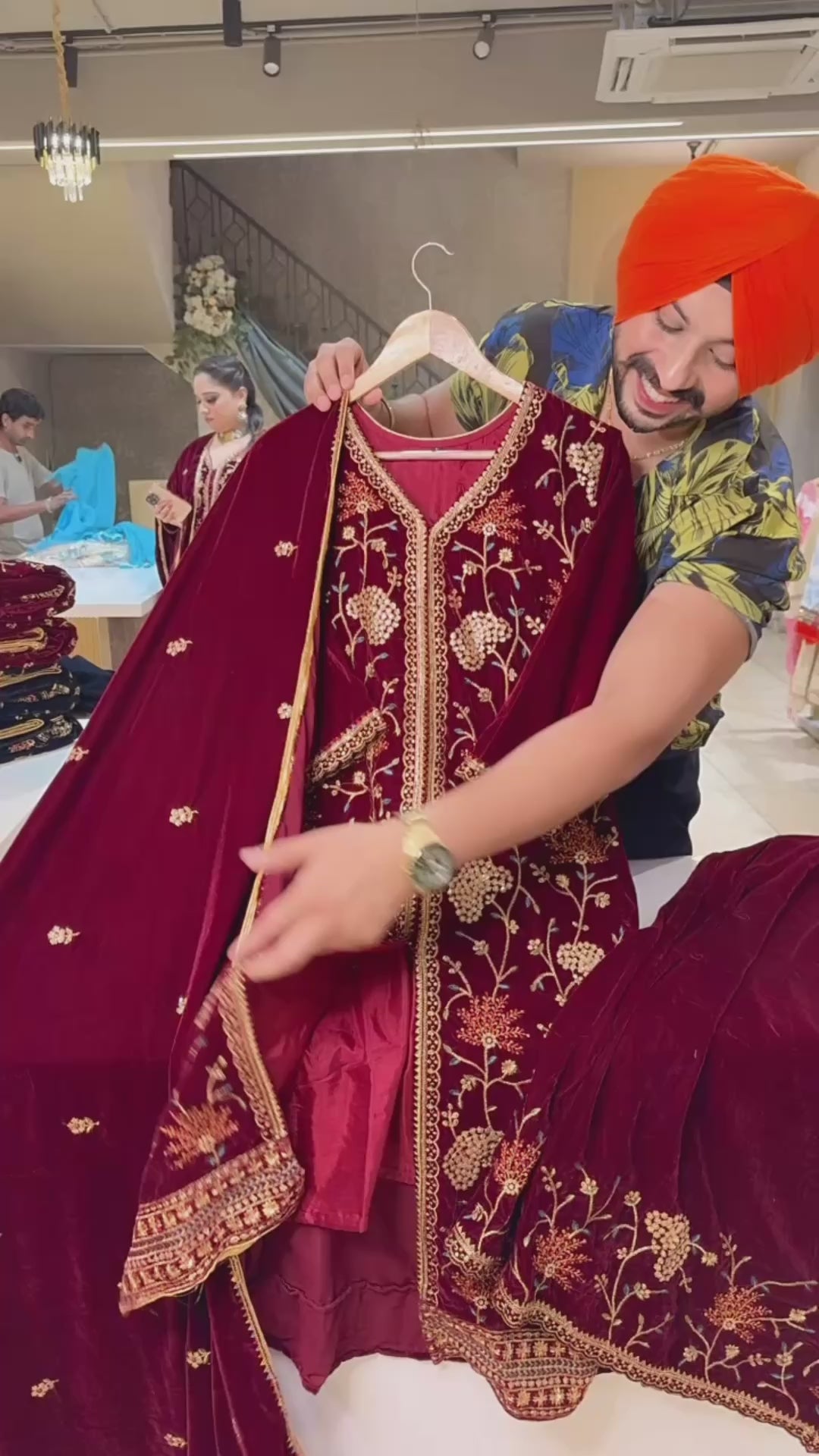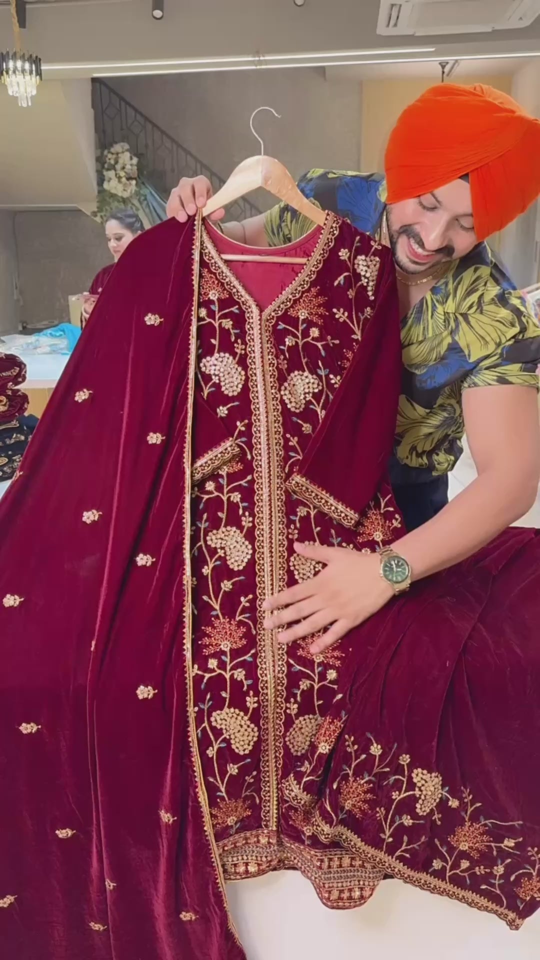 Maroon Velvet Fully Heavy Embroidered Front & side Slit Azaaro set with Beautiful Duppata