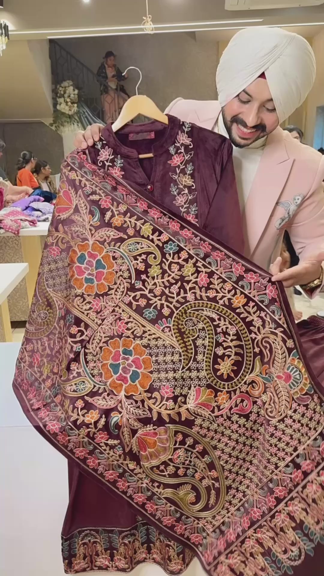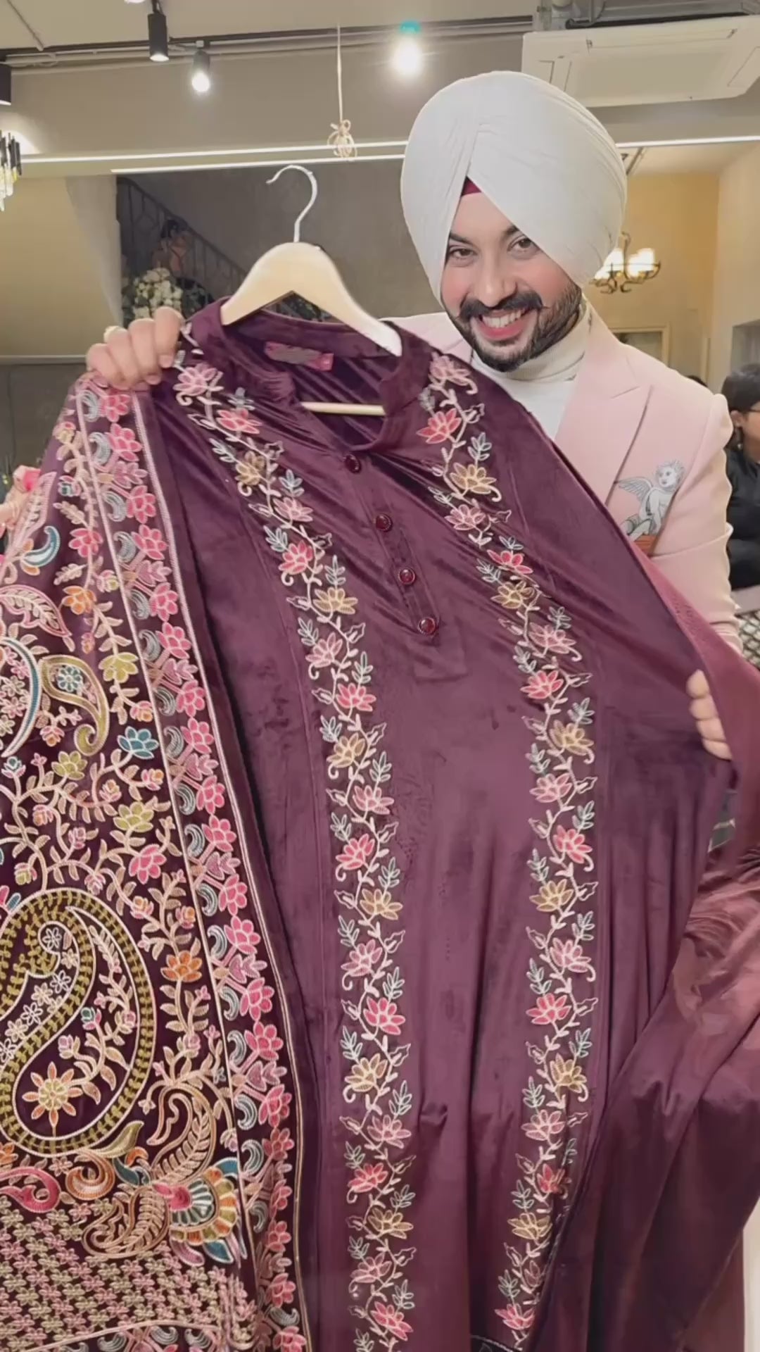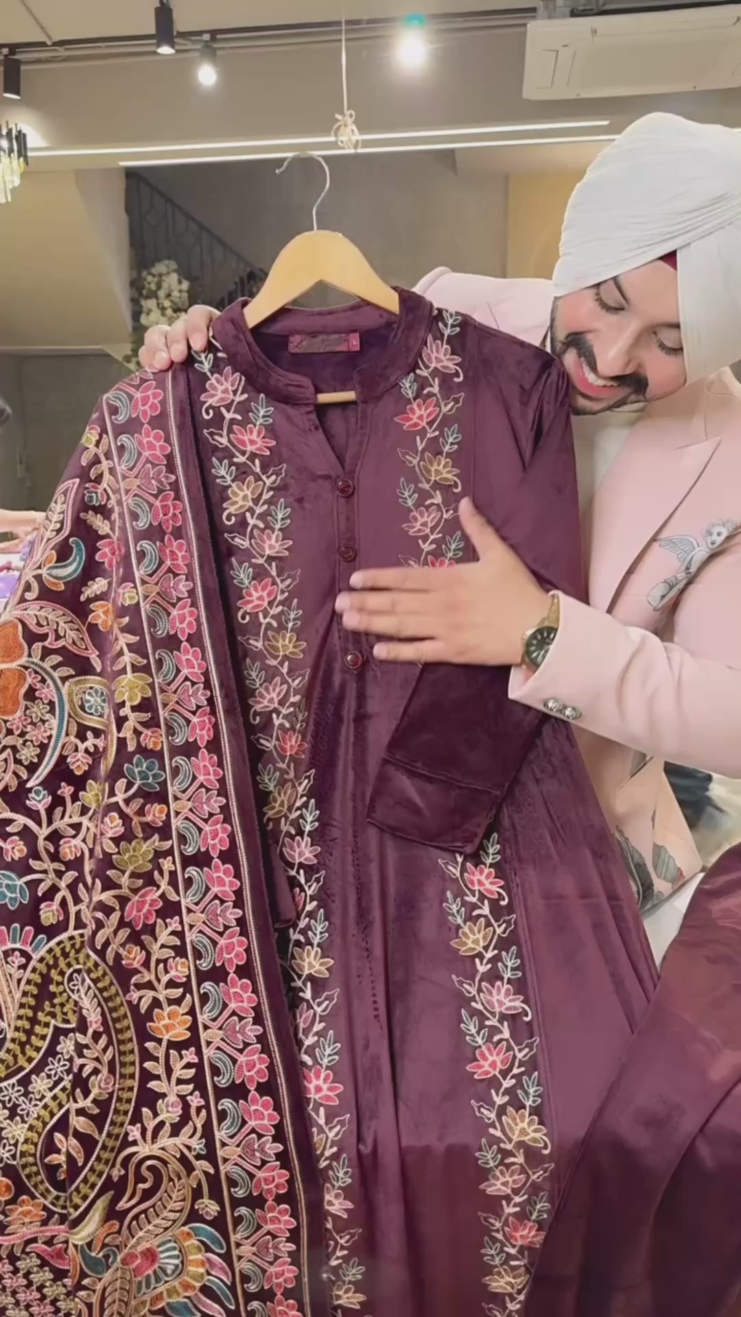 Dark Maroon Fully Strechable velvet embroidered A-line Suit with Heavy Duppata