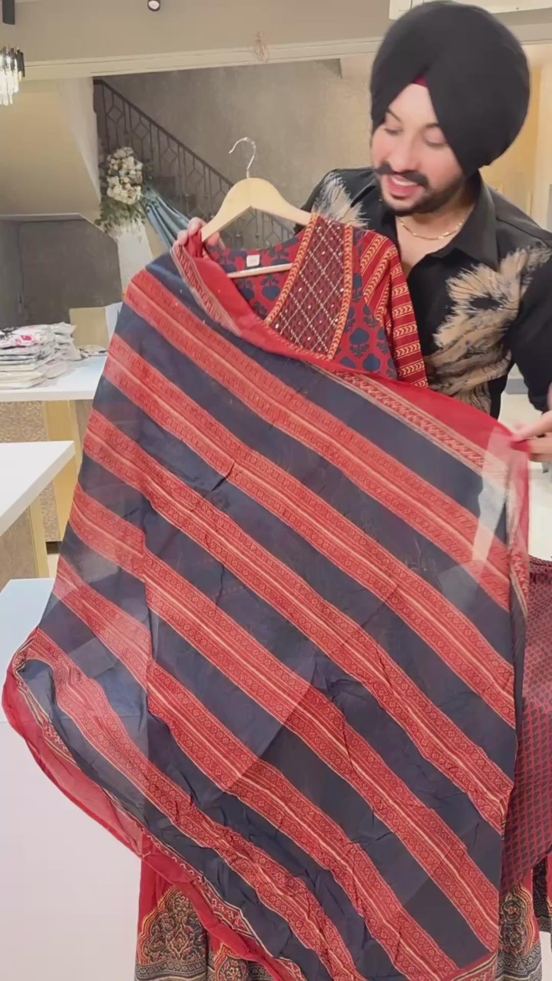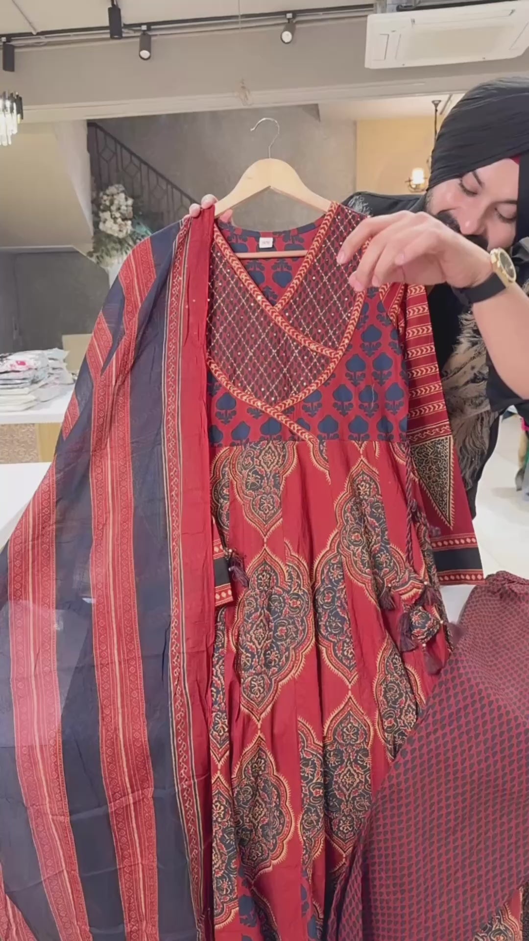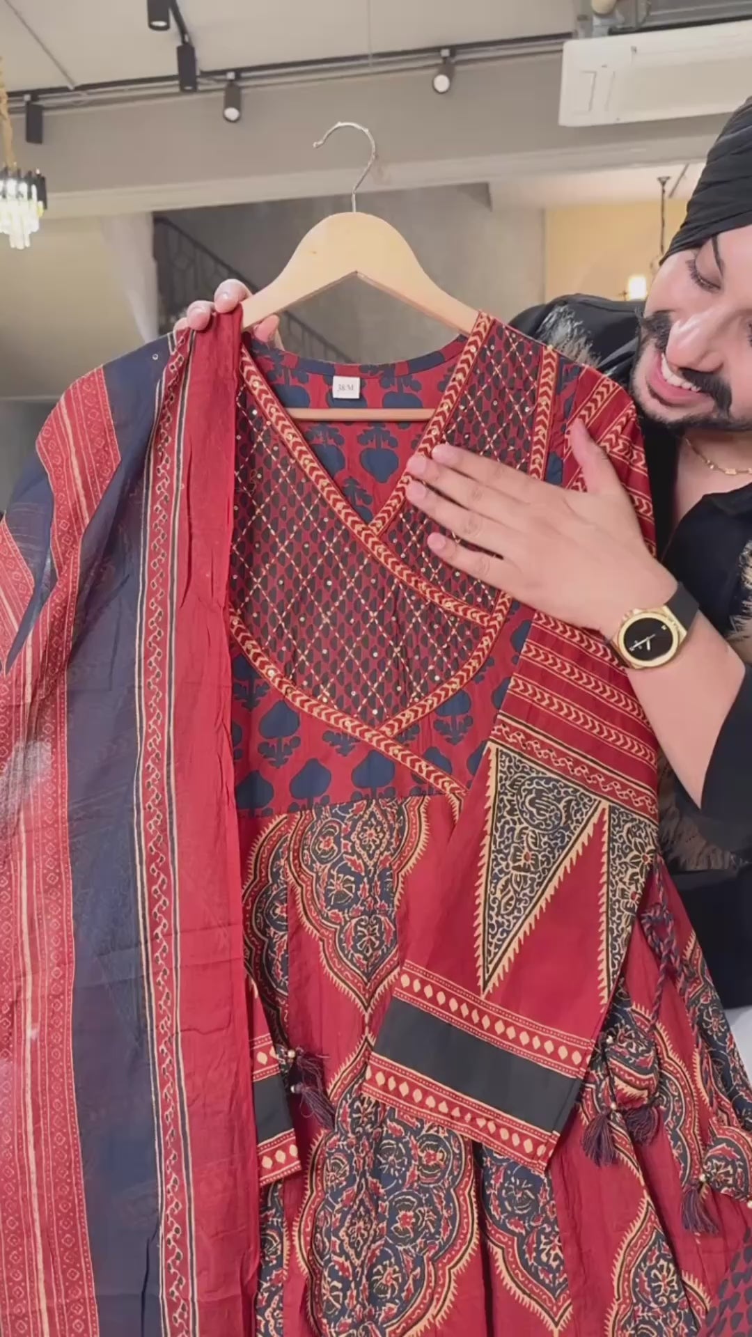 Maroon & Blue Pure Cotton Angrakha Jaipuri Print Anarkali Suit with Beautiful Duppata