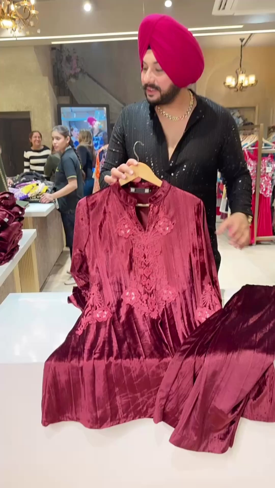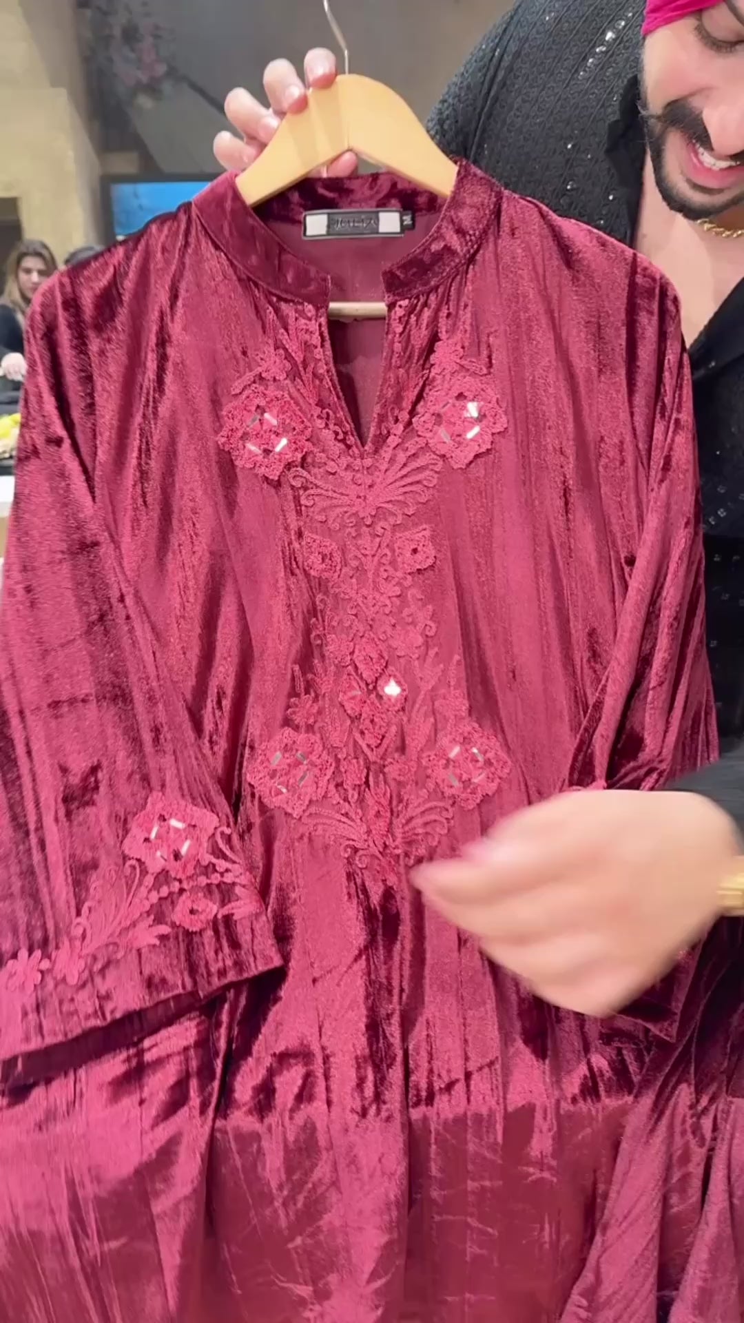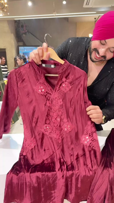 Maroon Crush Velvet Self Embroidered Party Wear Paplem Coord set