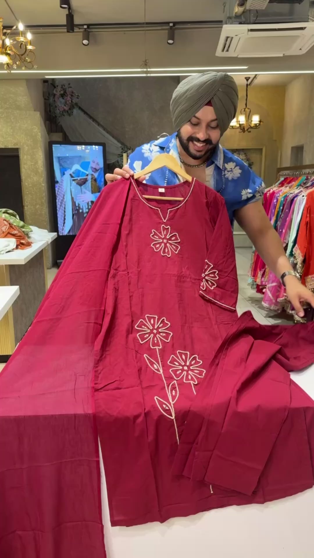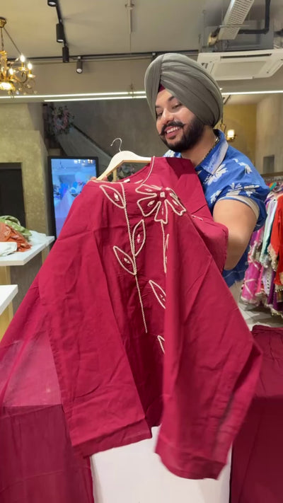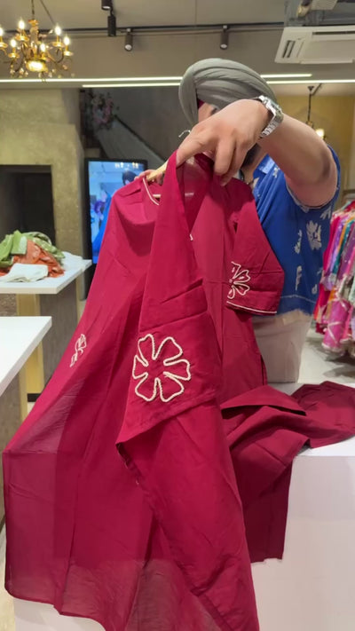 Maroon Pure Cotton Floral Embroidered Semi Formal Suit with Beautiful Duppata
