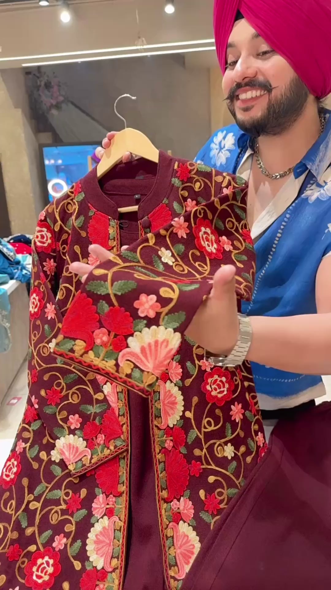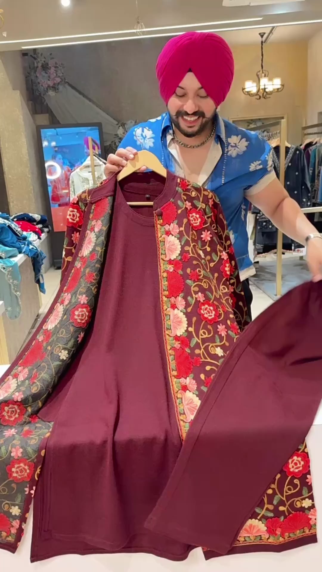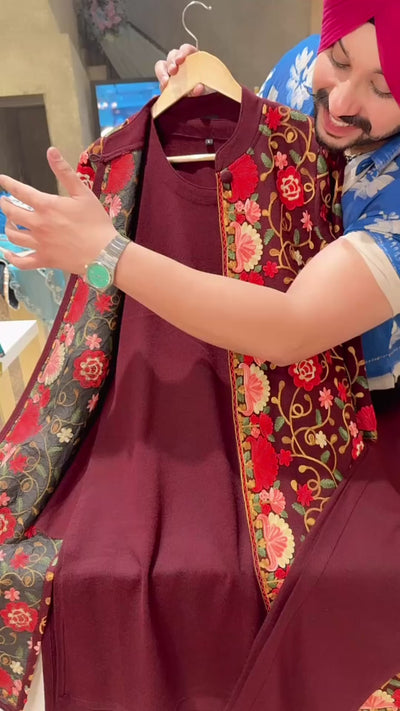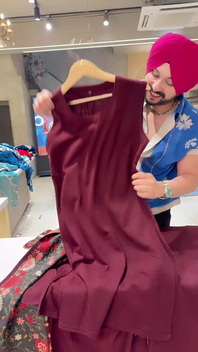Maroon Woolen Long length Coord set With Heavy Kashmiri Embroidered Shrug