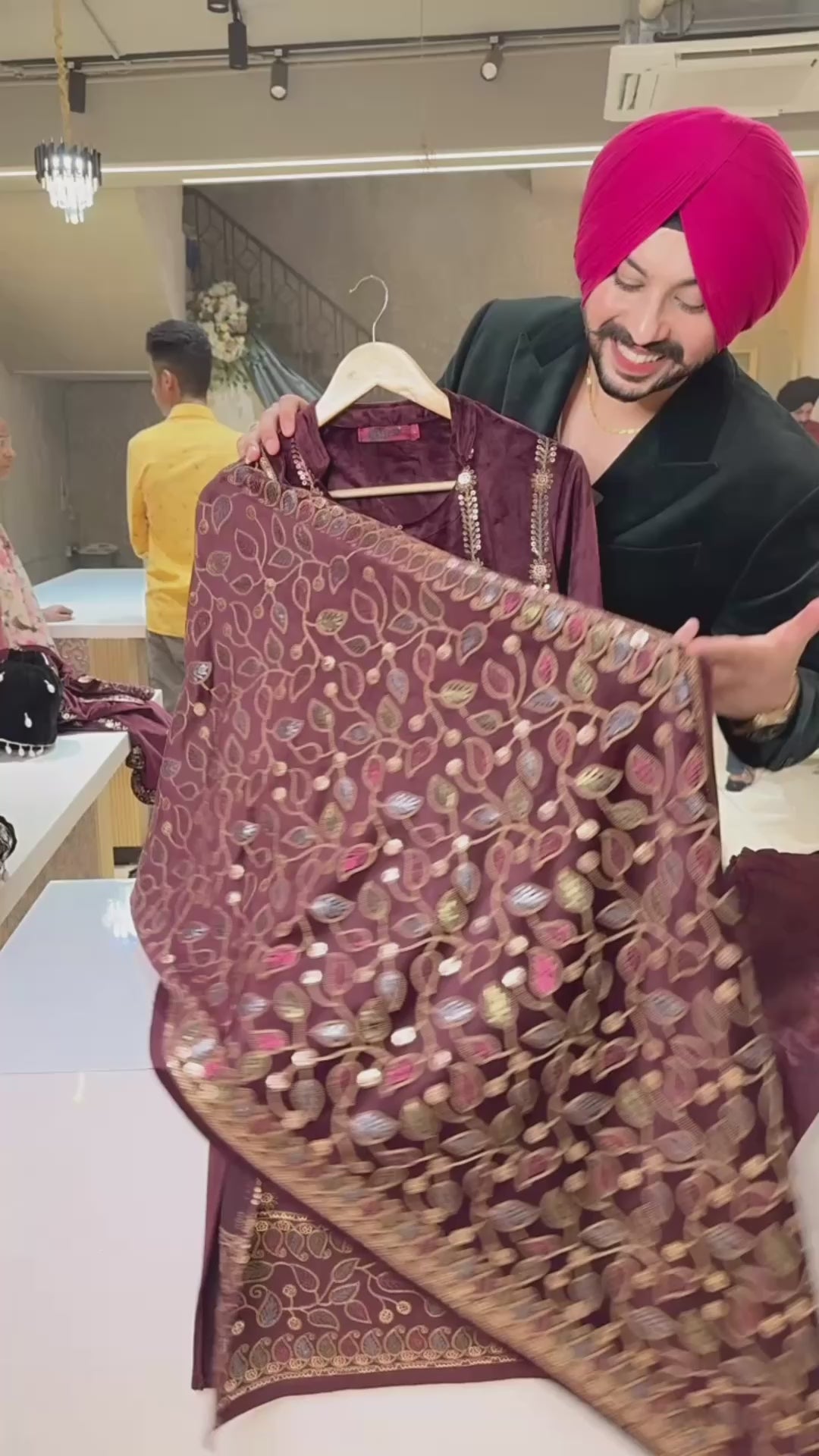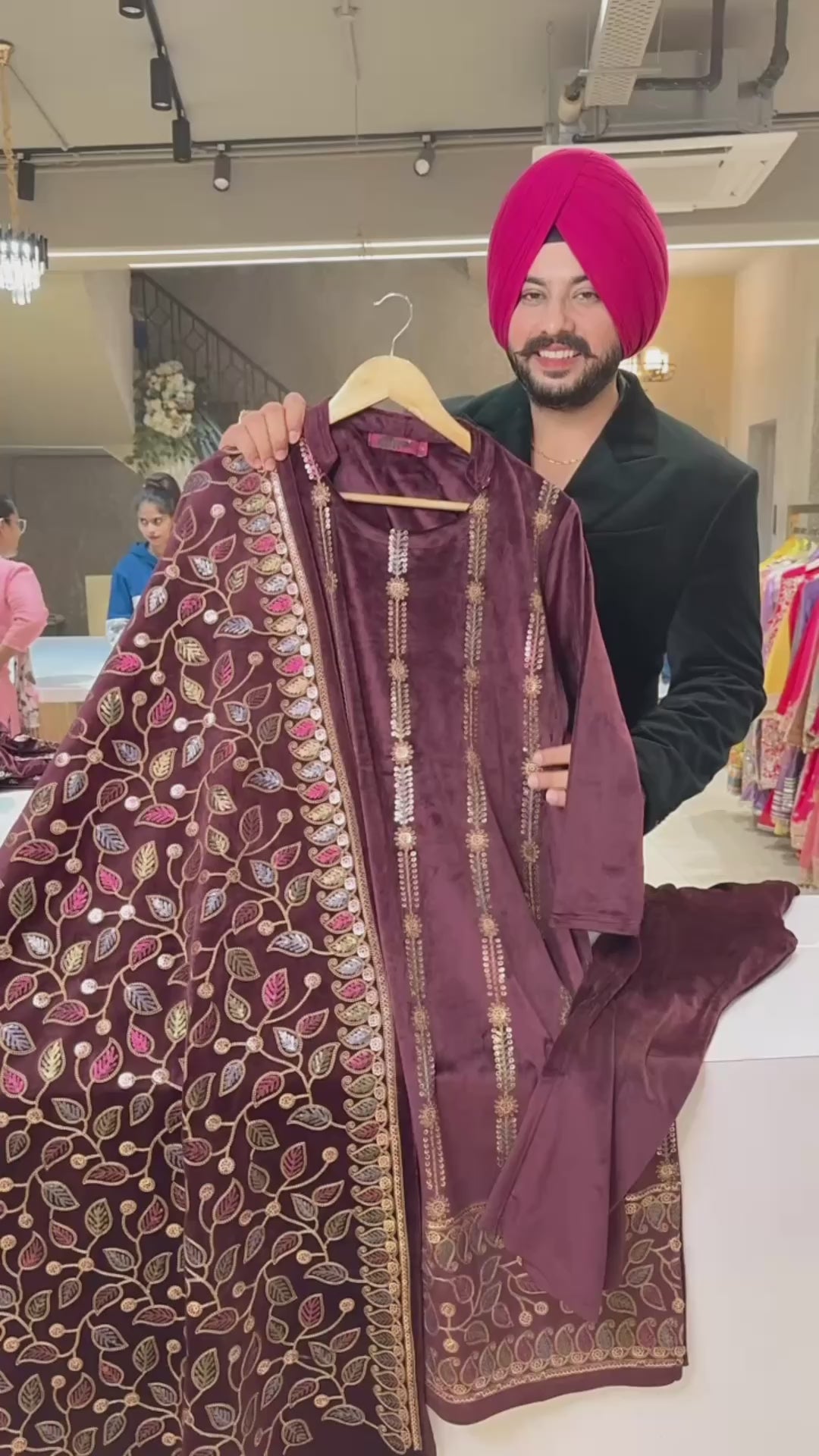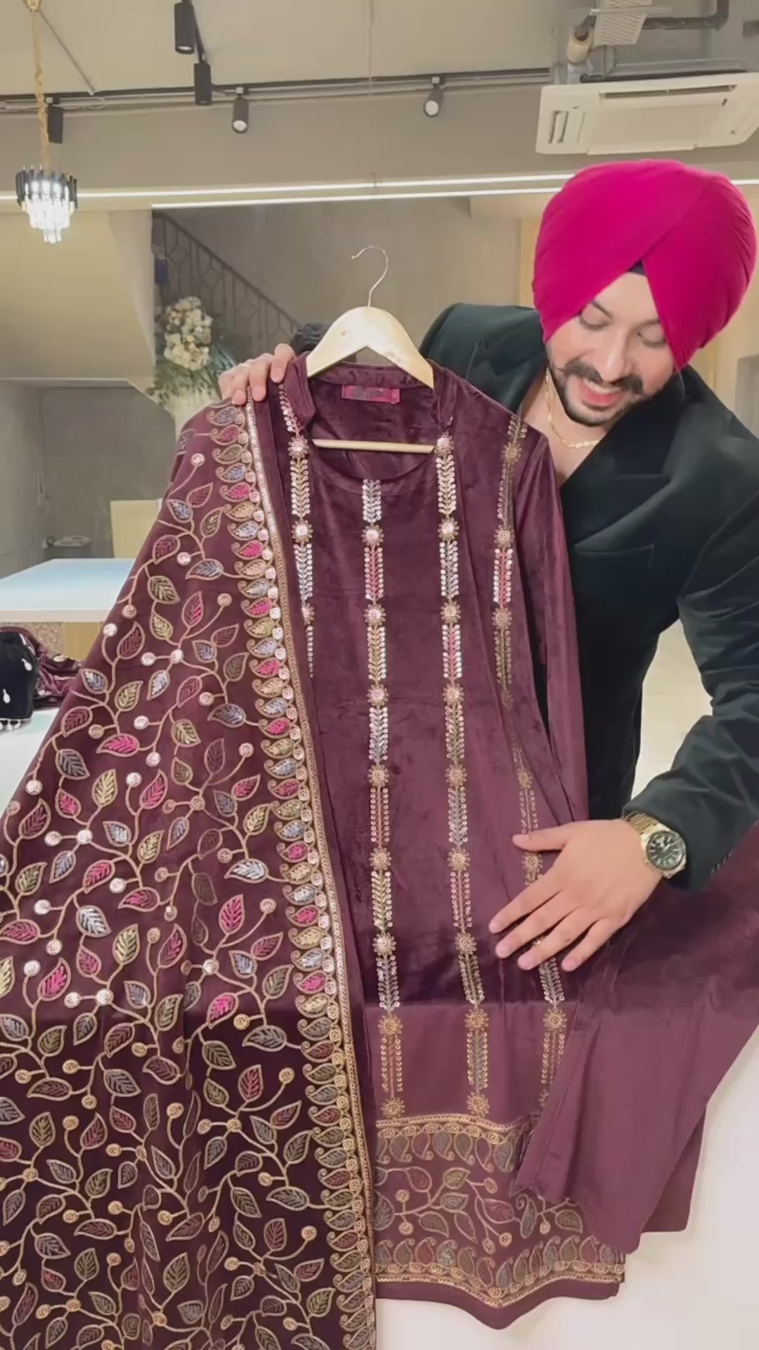 Maroonish wine Heavy Strechable velvet Suit with Fully Embroidered Duppata