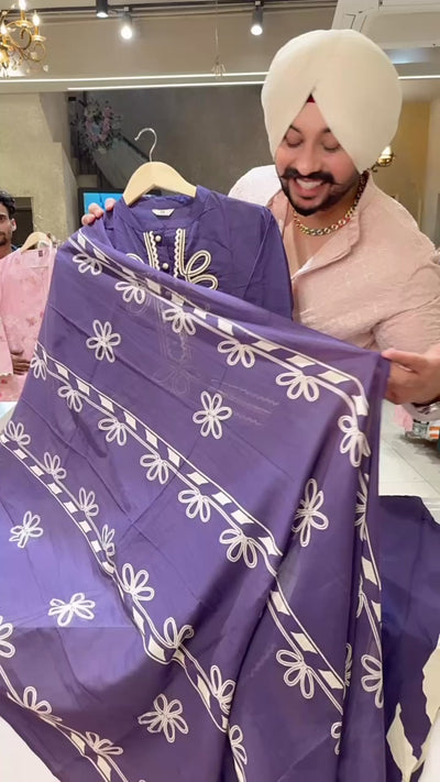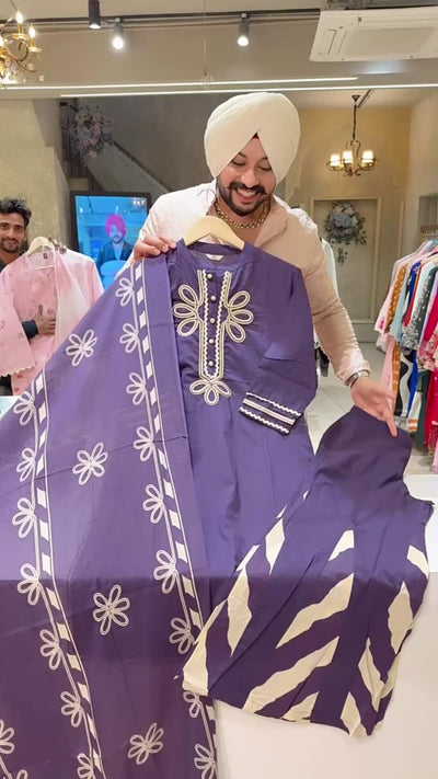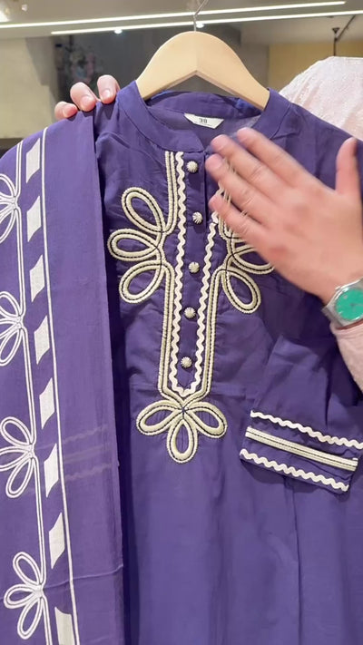 Matt Purple Pure Cotton Stylish Bell Botton Suit with Beautiful Embroidery work on neck