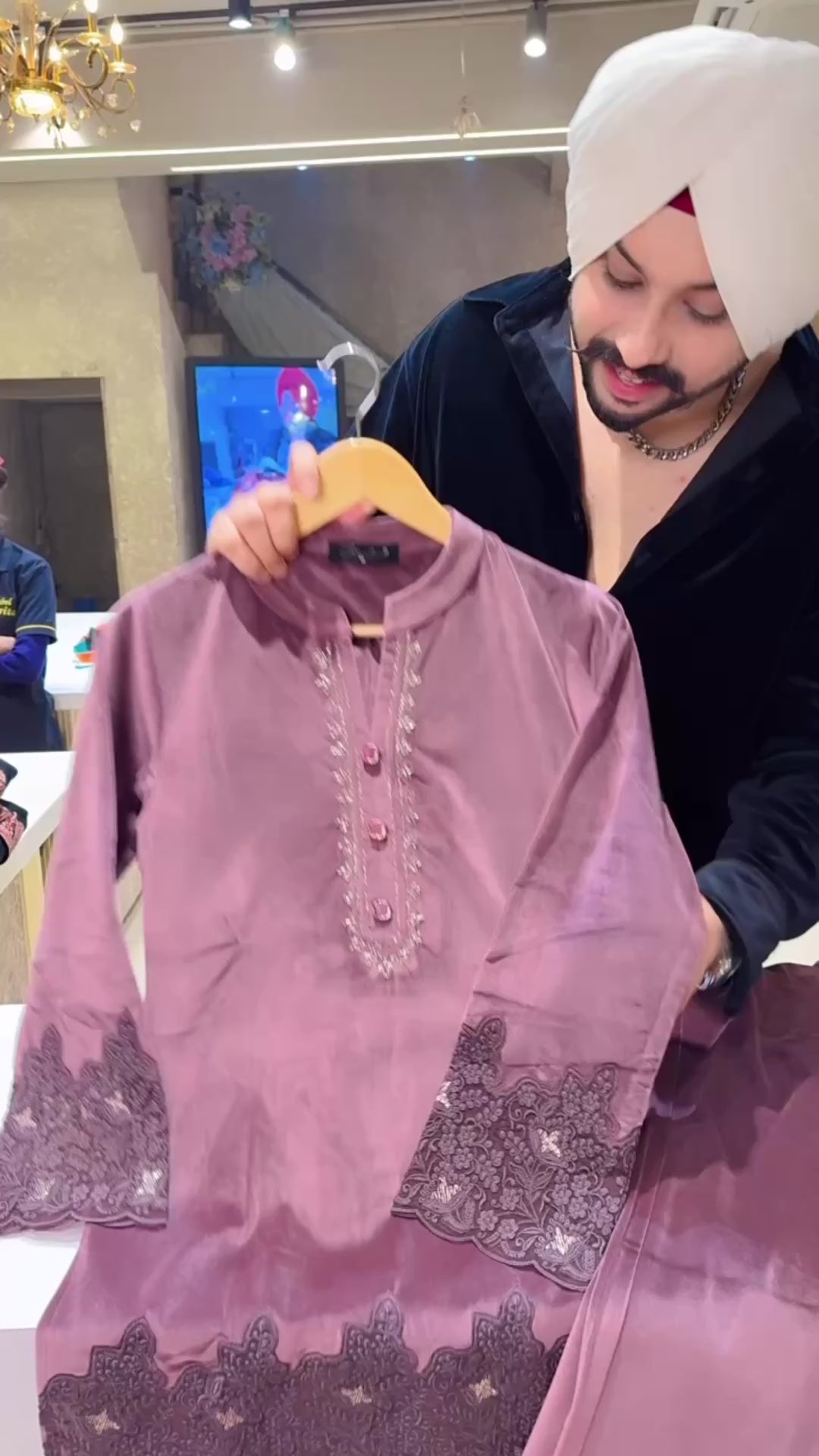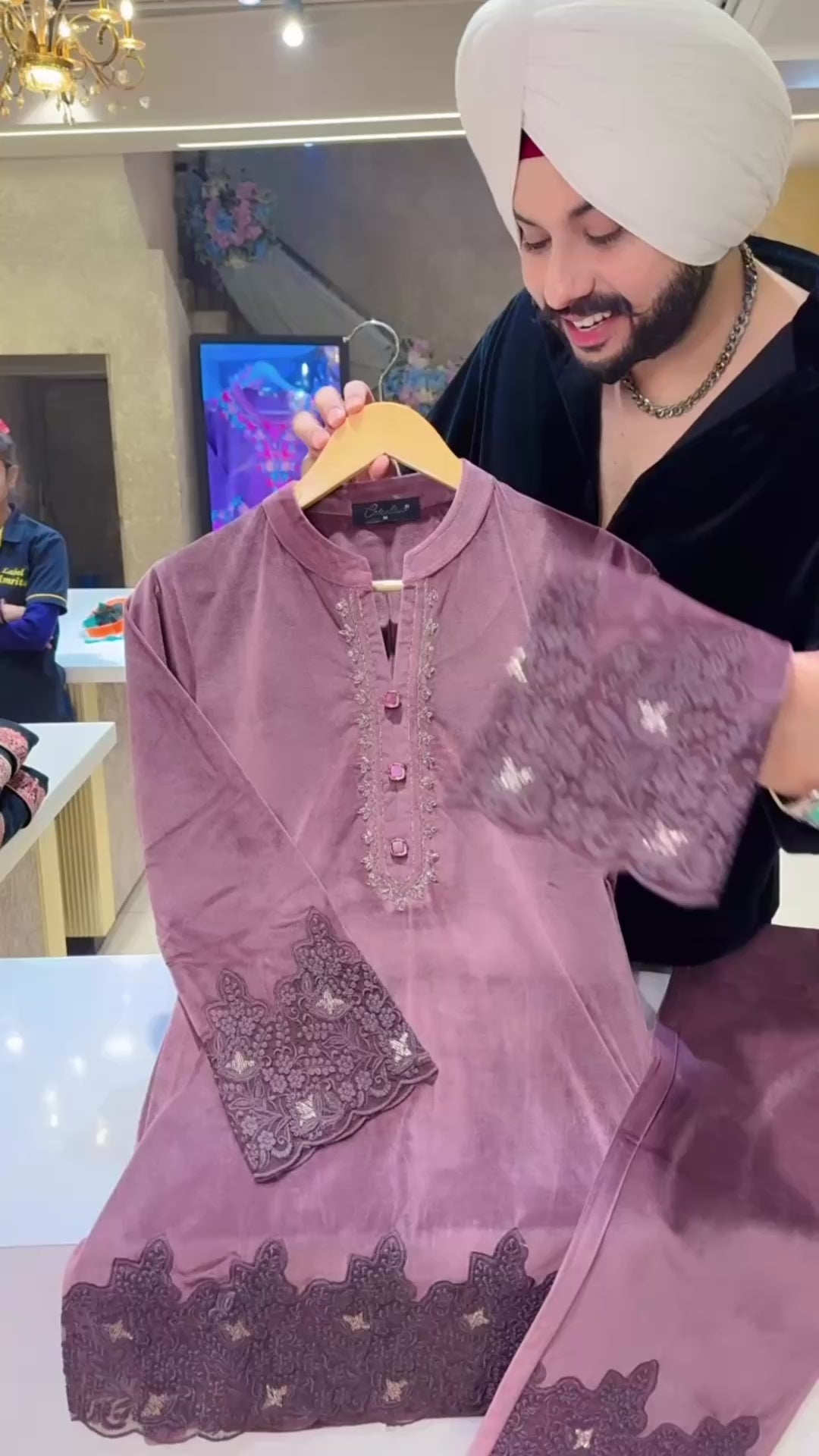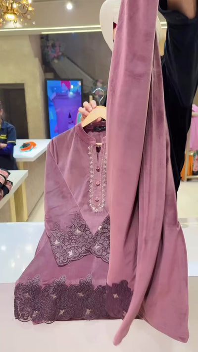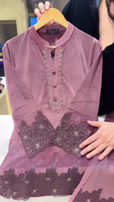 Onion Mauve Velvet Hand Embroidered Coord set with Self embroidered Sleeves & Border