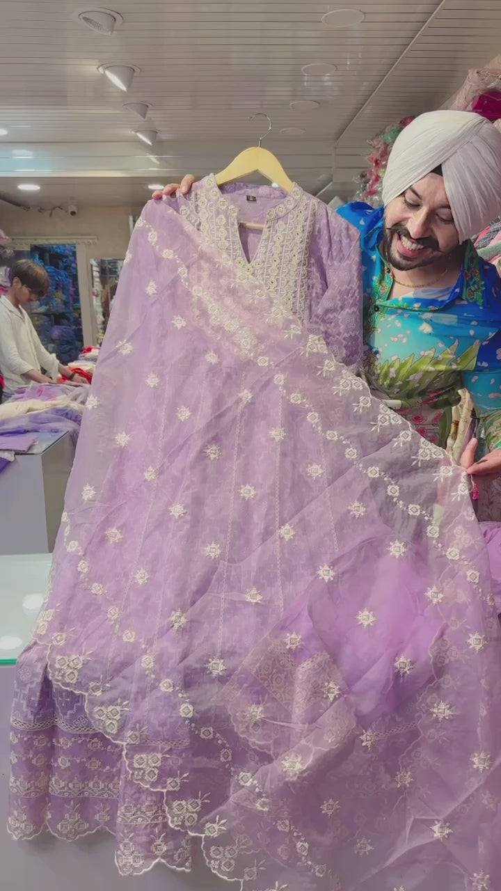 Lavender Pure Cotton Embroidered Anarkali suit with Beautiful Organza Duppata