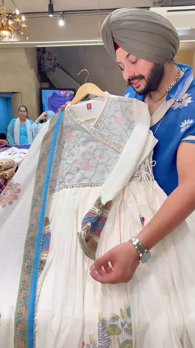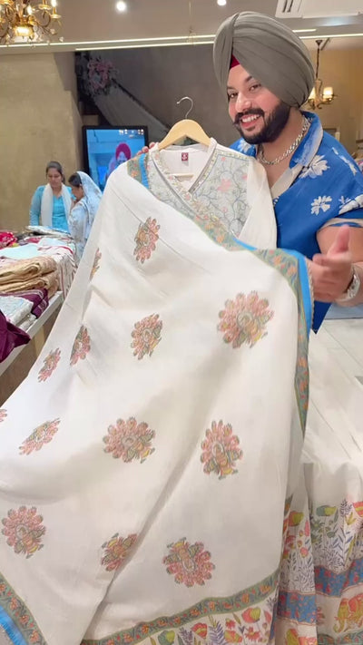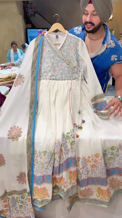 Moon White & Blue Mal Cotton Angrakha overlap slit Embroidered Full Flair Anarkali Gown With Beautiful Duppata