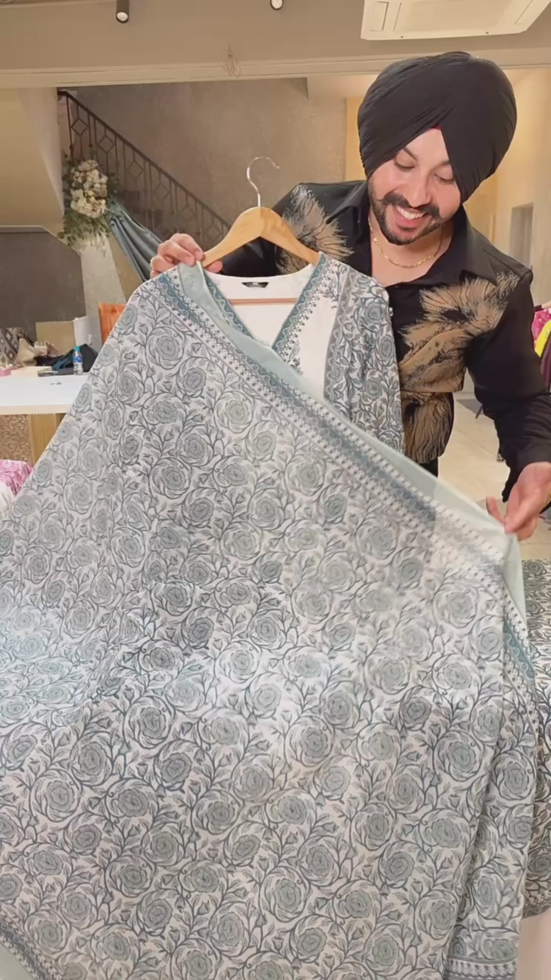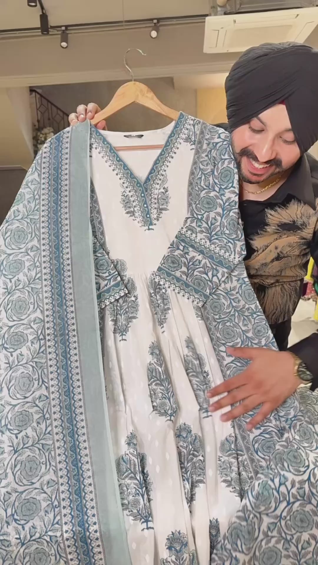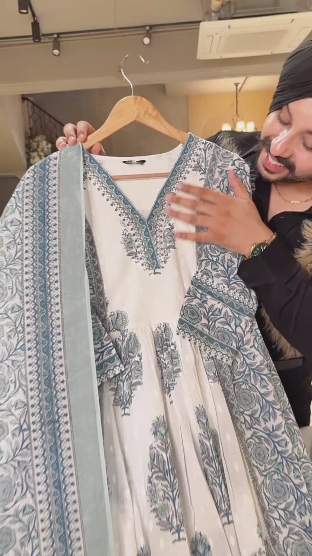 Moon White & Blue pure Cotton A-line Front Gathering Suit with Beautiful Duppata