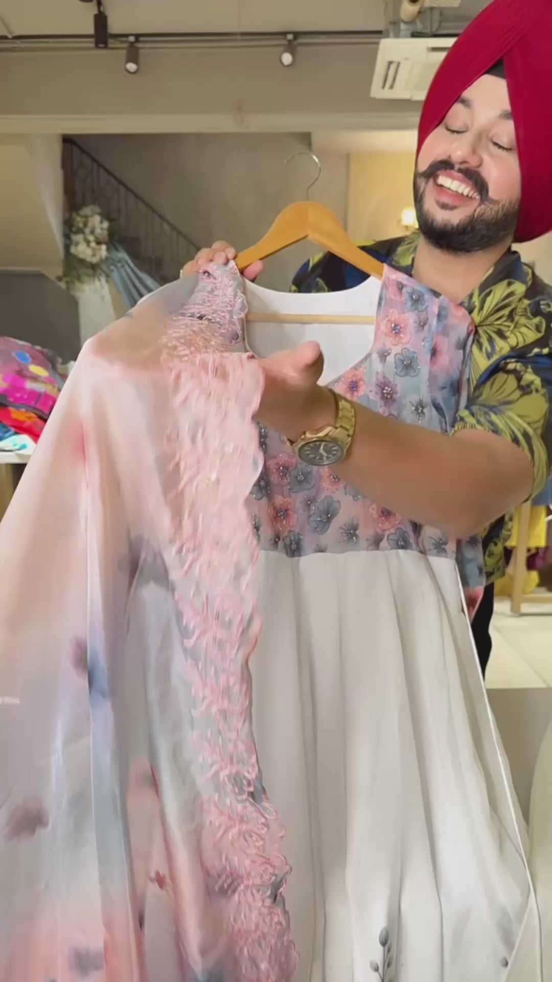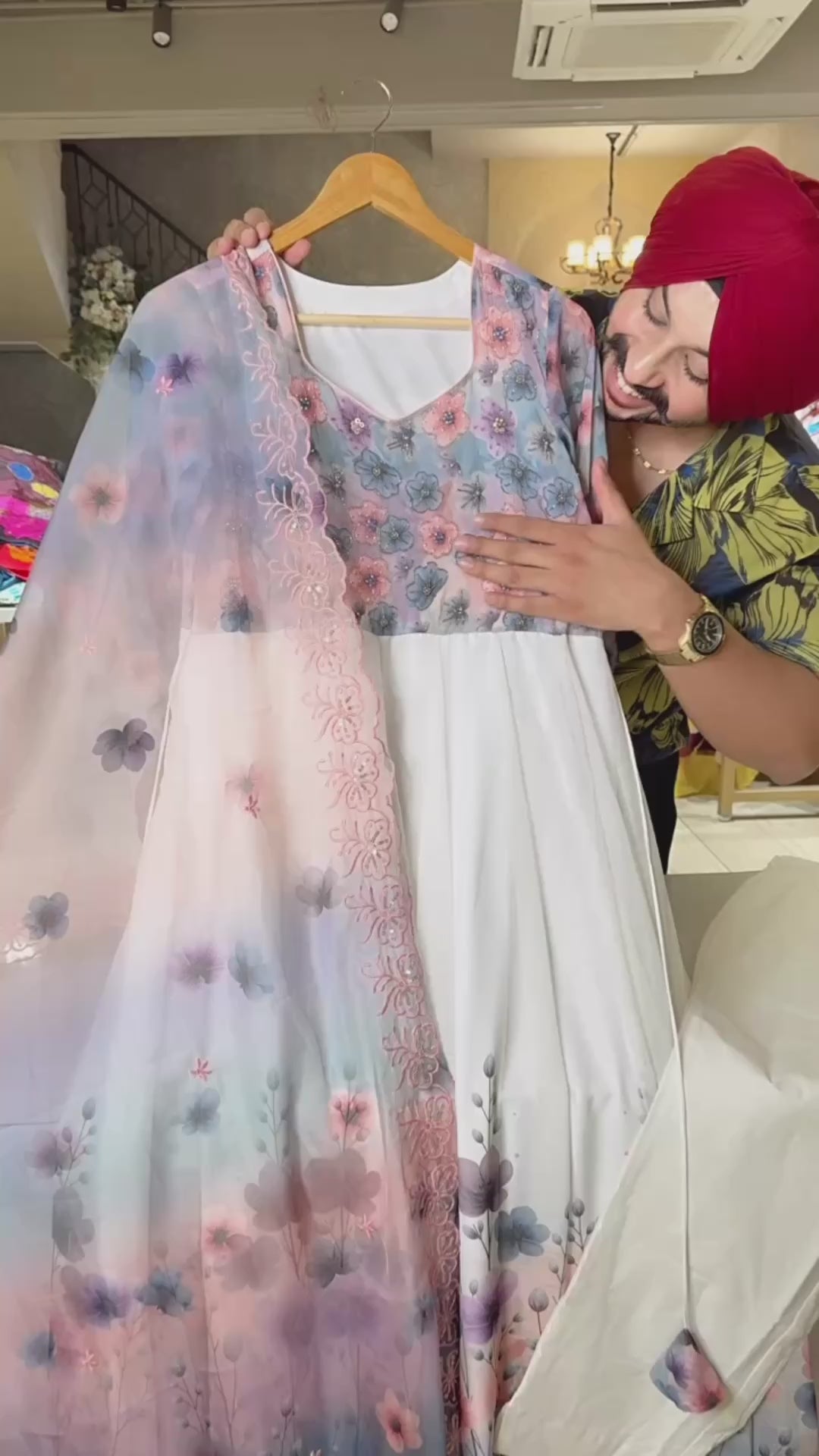 Moon White & Multicolored Soft Chiffon Summerish Floral Anarkali suit with Hand Embroidery work on neck