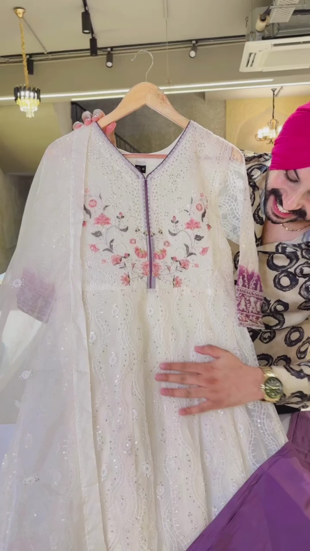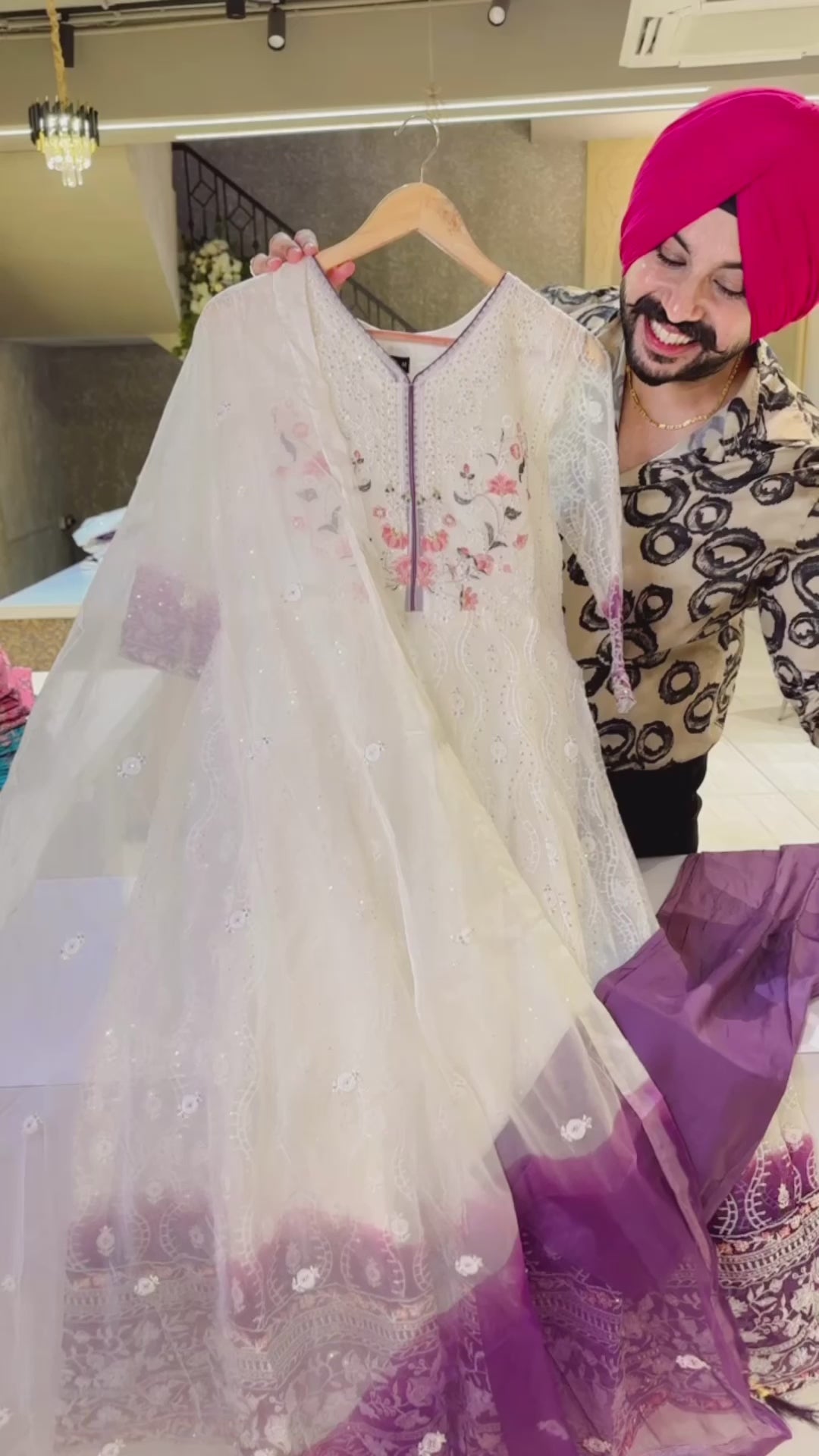 Moon White & purple Organza fully embroidered Anarkali Suit with beautiful Duppata