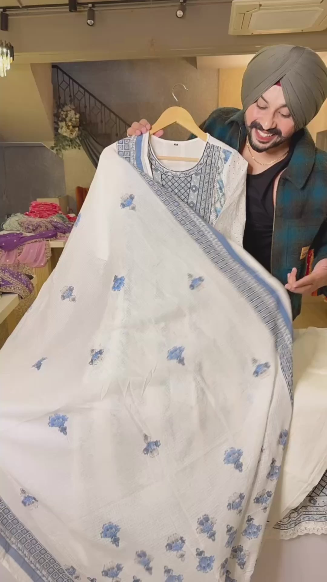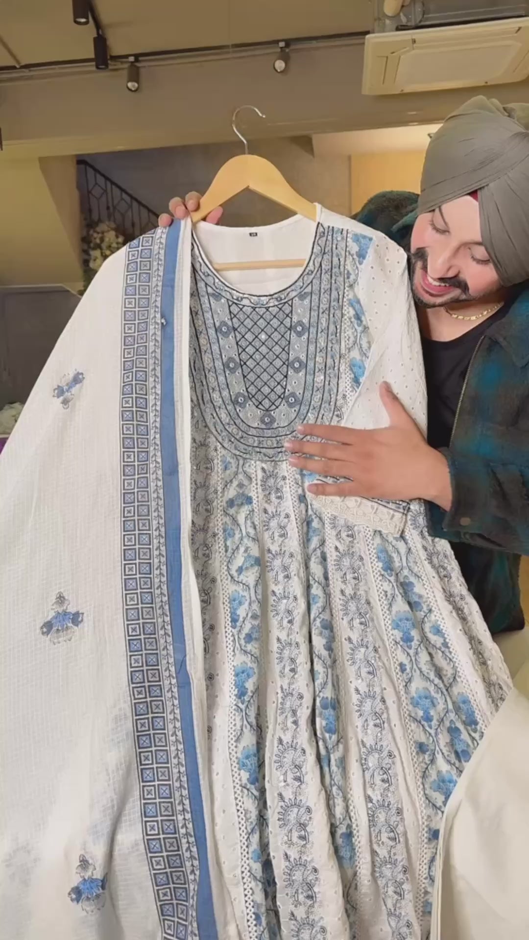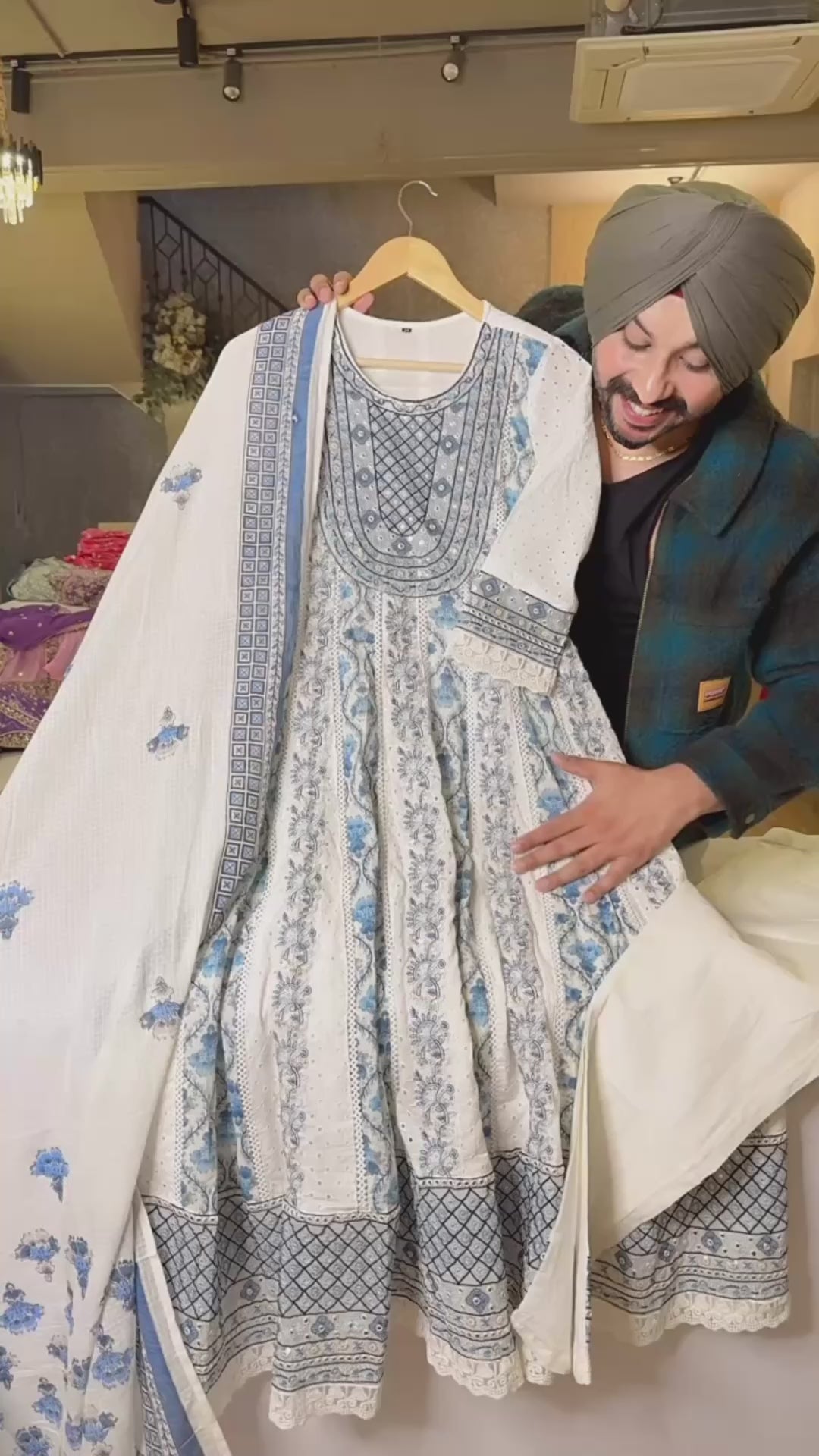 MoonWhite & Blue Pure Cotton Full Flair Heavy Embroidered & Shifli Work Anarkali Suit with beautiful Kota Doria Duppata