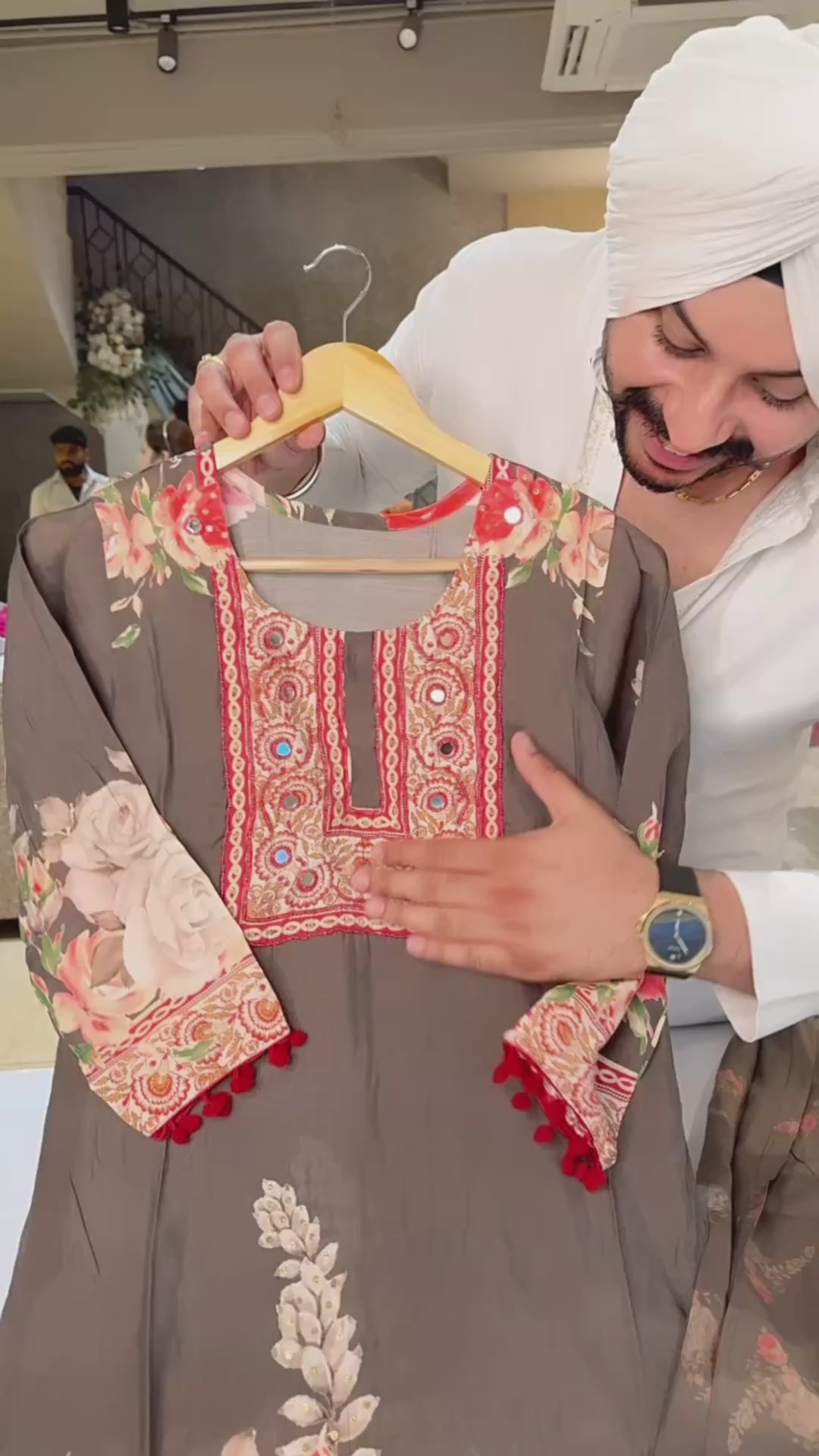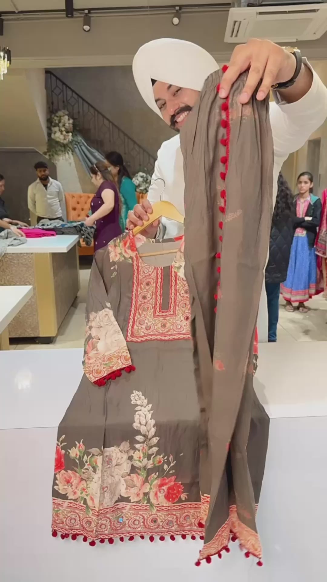 English Brown Crepe Hand embroidered Pom-Pom Coord set with Designer Pants