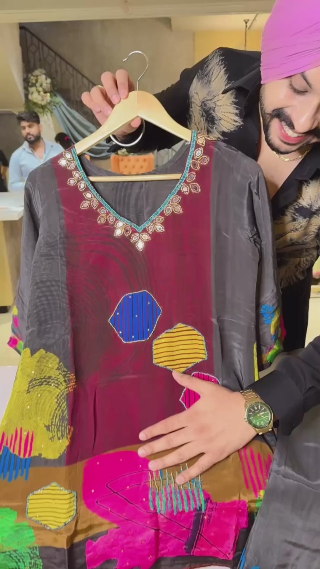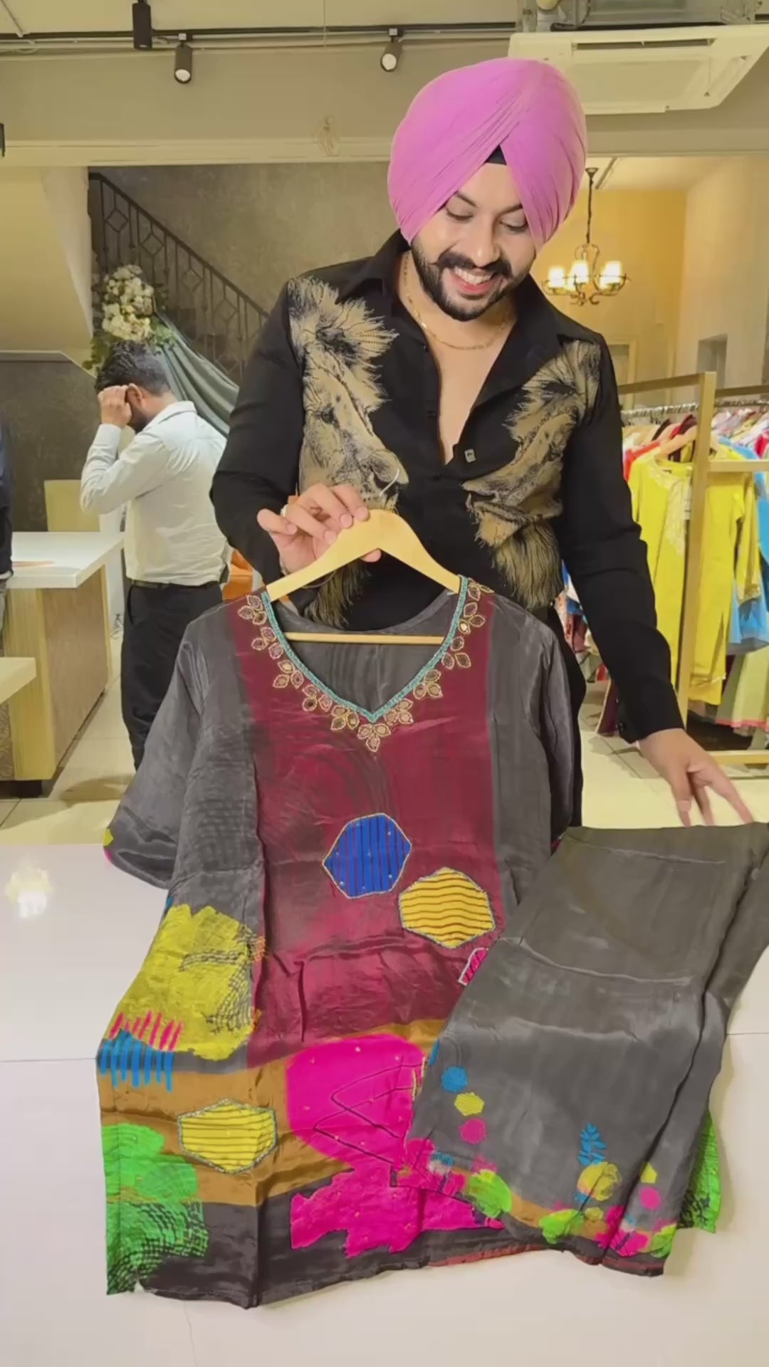 Dark Grey & Multicolored Crepe Hand embroidered & mirror work Coord set