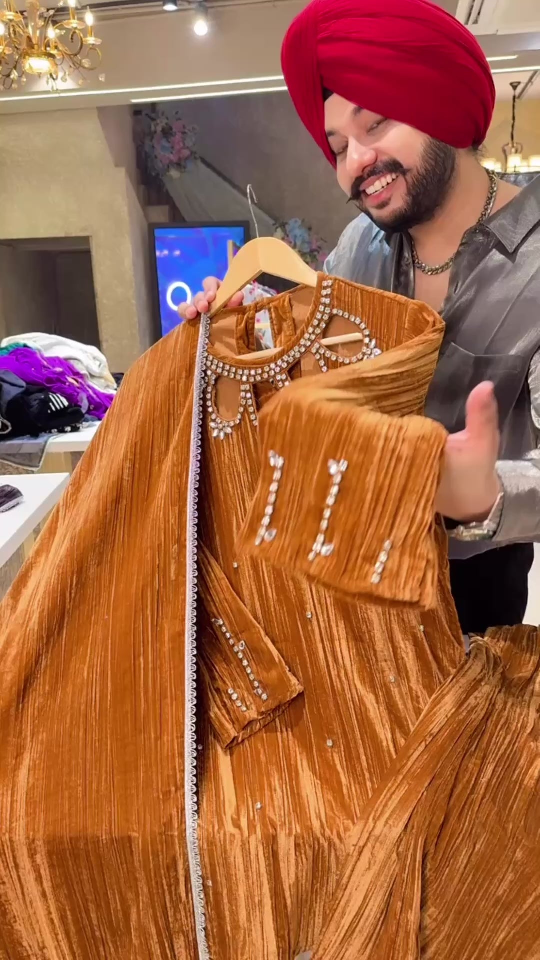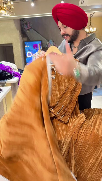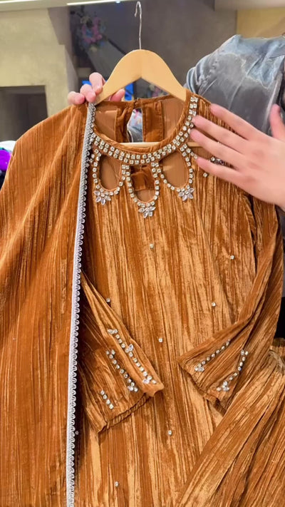 Mustard Crush Velvet Designer Neck Heavy Stone Work Indo western Suits