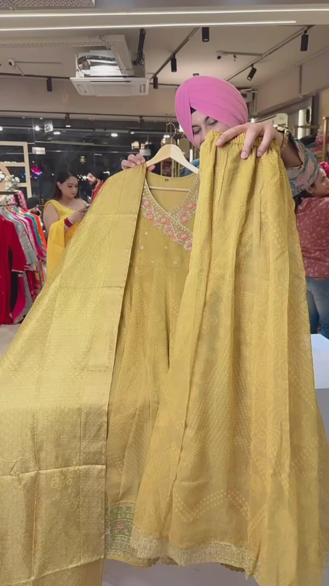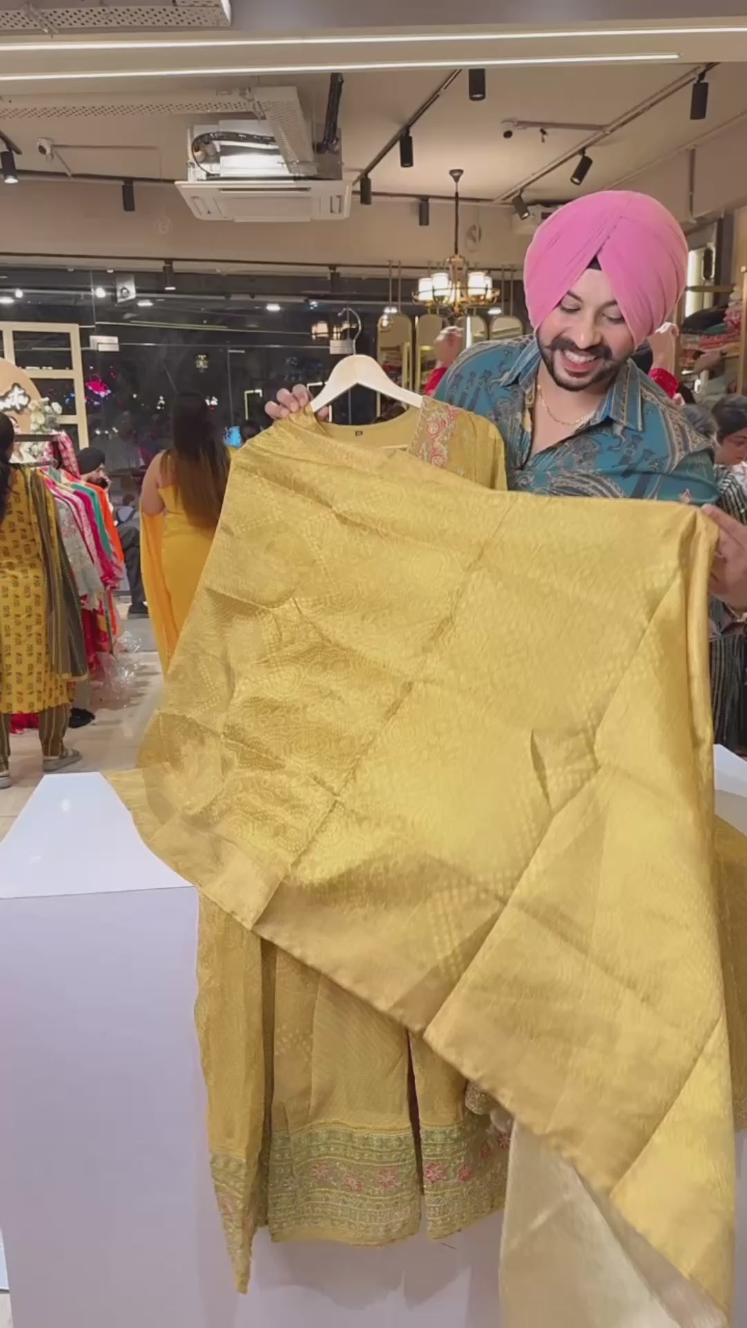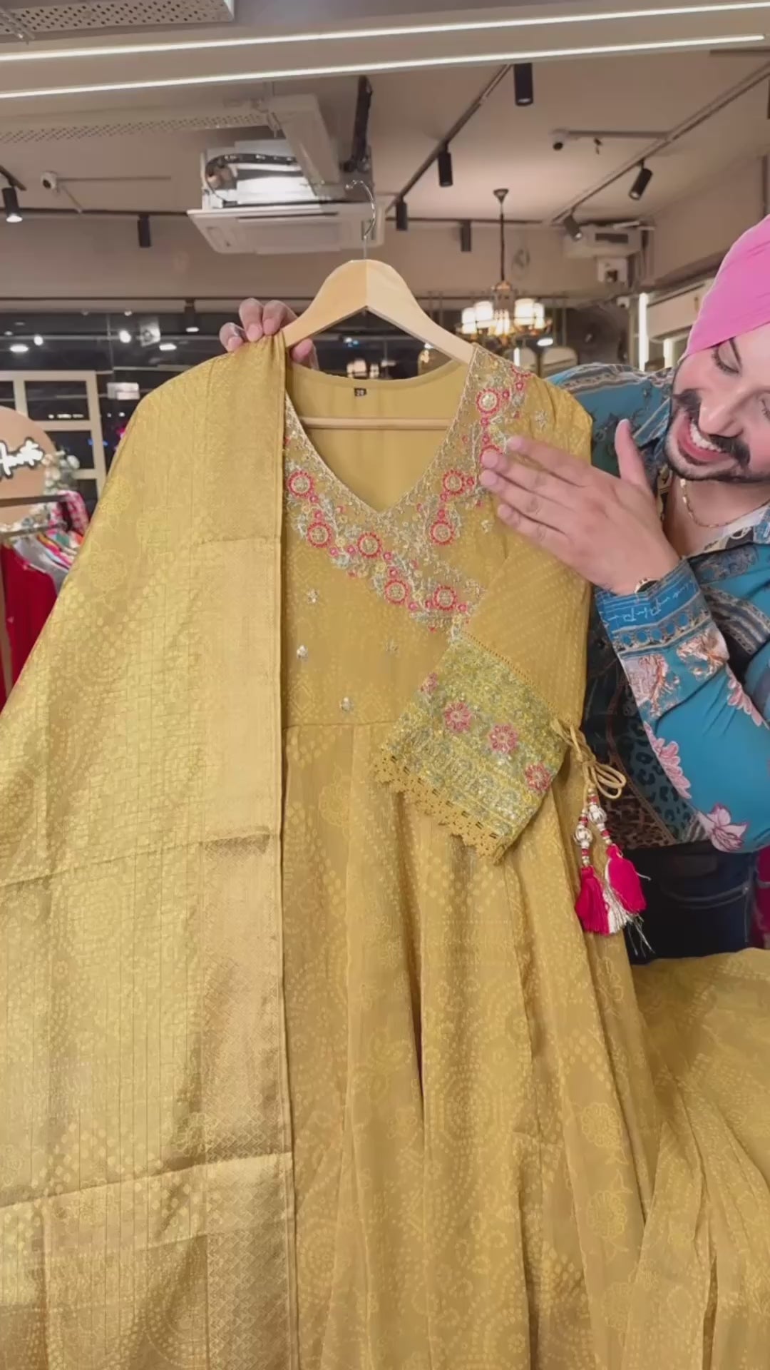Mustard shimmer organza Angrakha Anarkali suit with Sharara