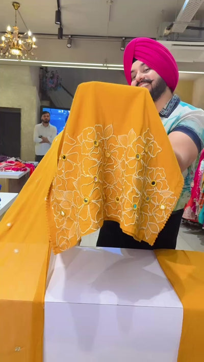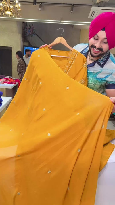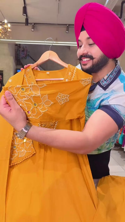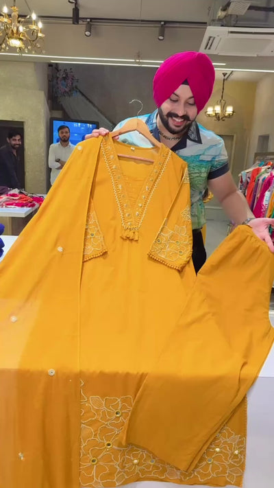 Mustard yellow Colour Soft Cotton Semiformal Straight Suit with Heavy Embroidery work on sleeves & Border