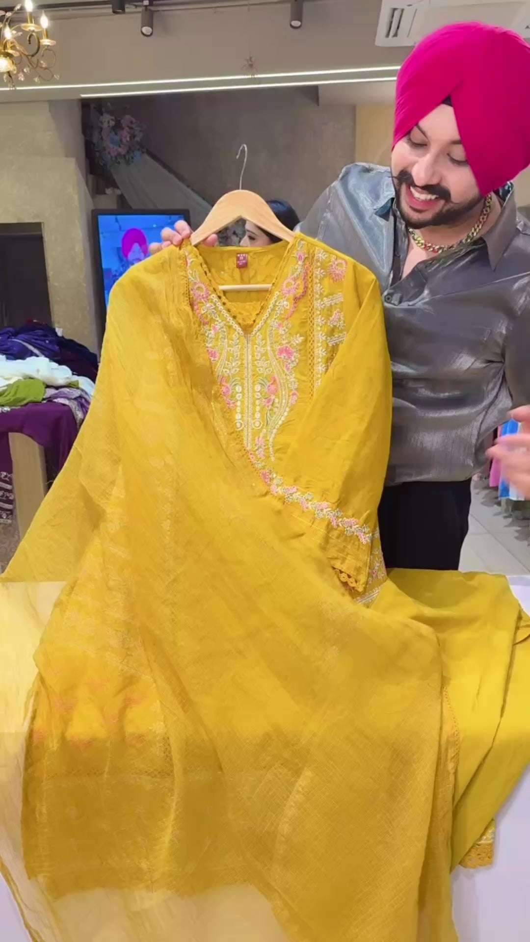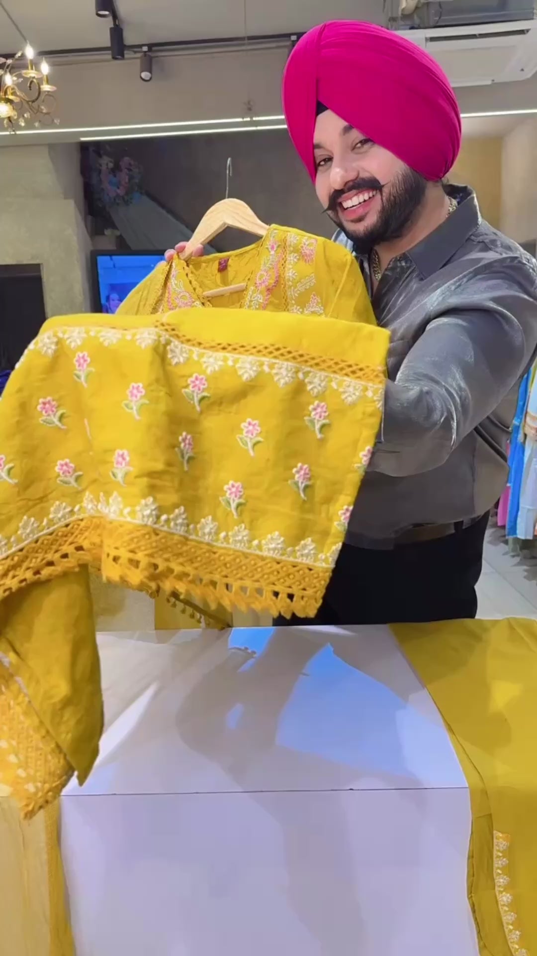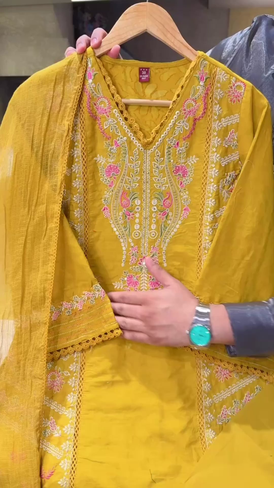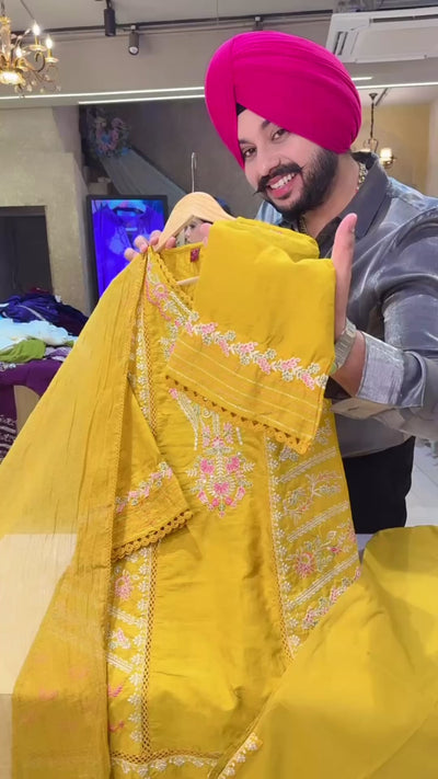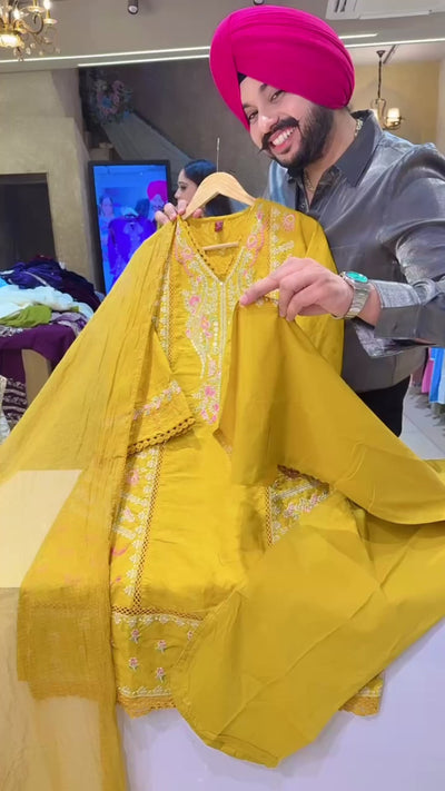 Mustard yellow Jaquard cotton Fully Embroidered Party Wear Suit with Embroidered Pants & Kota Doria Duppata