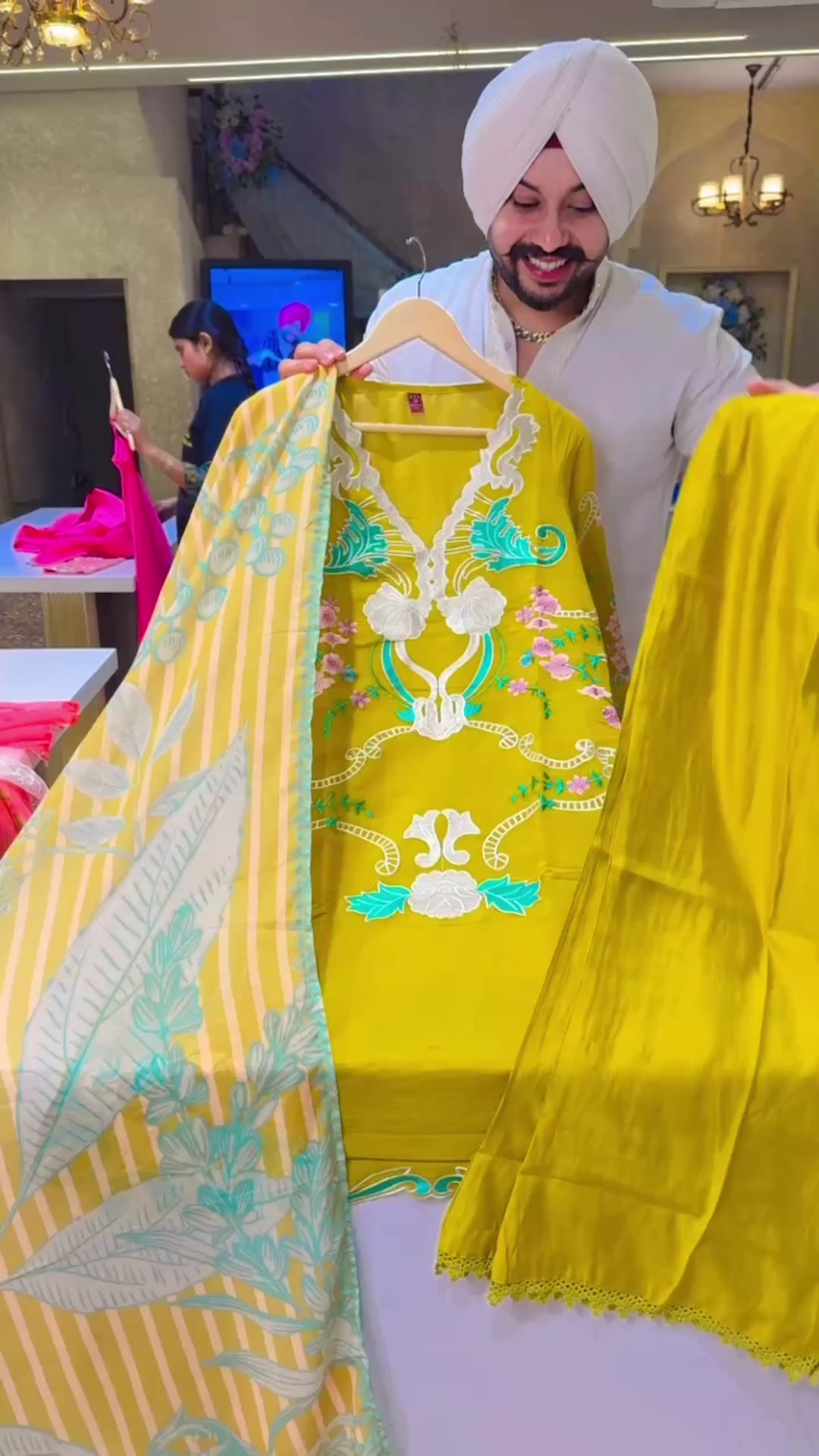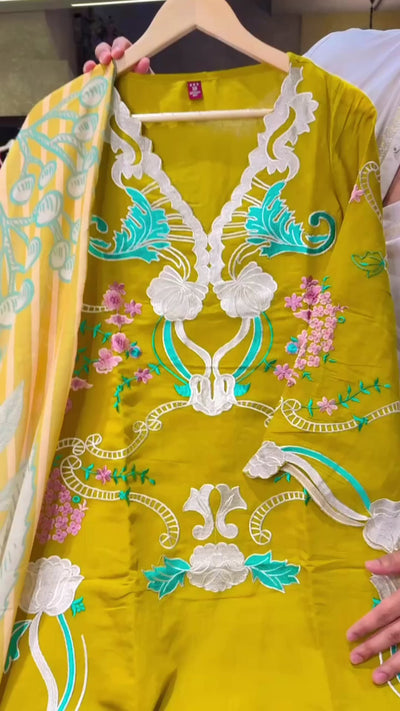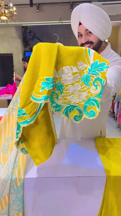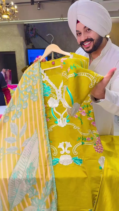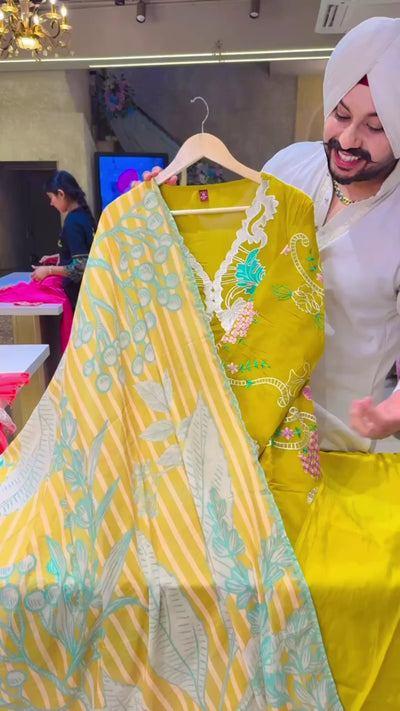 Mustard Yellow Mal Chanderi Fully Floral Embroidered Kashmiri Suit with Soft Leaf Print Duppata