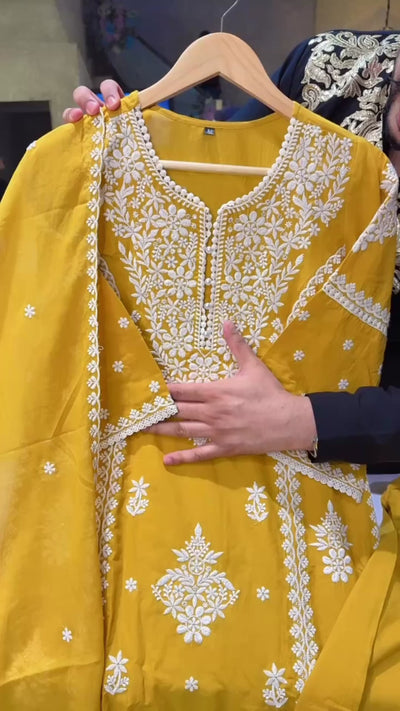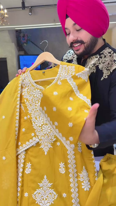 Mustard Yellow Mal Cotton Embroidered Semi Formal Straight Suit with Mal cotton Duppata