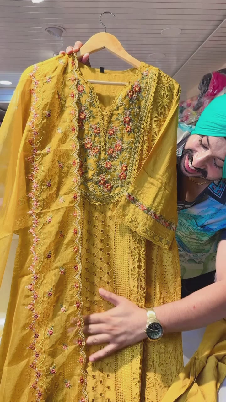 Mustard yellow Muslin silk Embroidered Pakistani suit with Beautiful Organza Duppata
