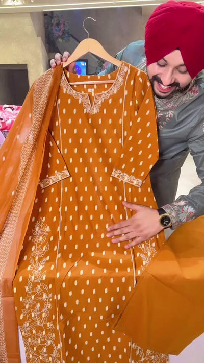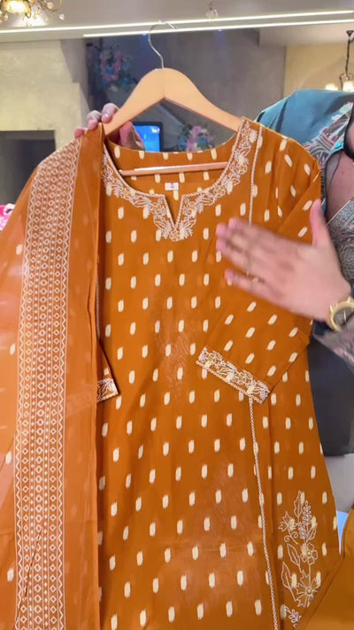 Mustard yellow Pure Cotton Embroidered Office Wear Suit With Beautiful Duppata