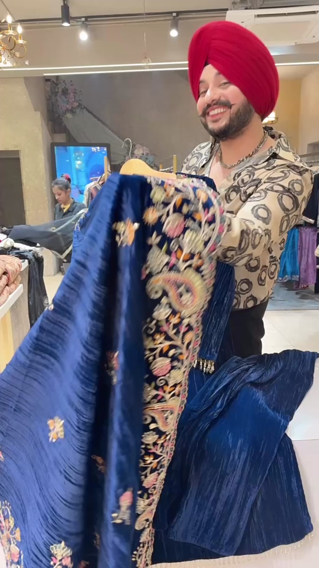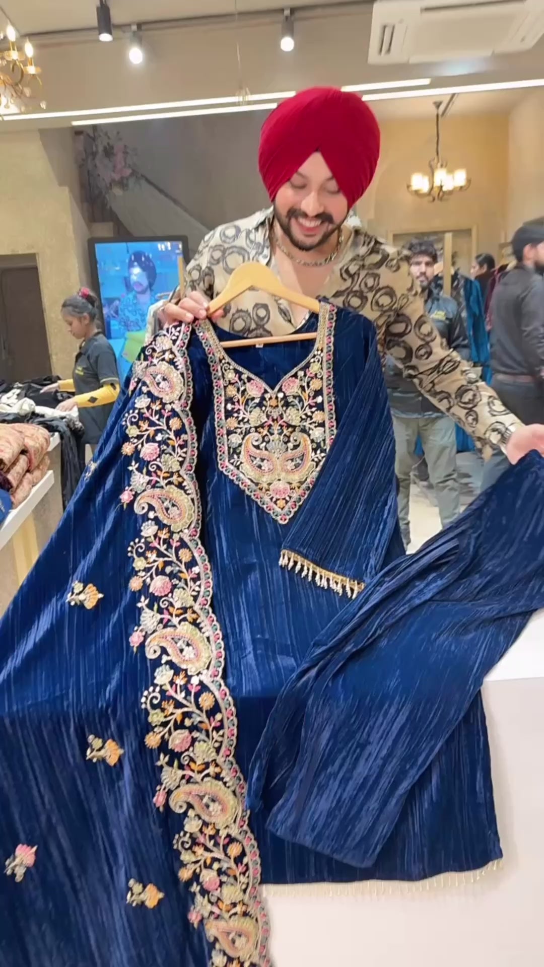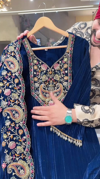 Navy Blue Crush Velvet Party Wear Straight Suit with Heavy Embroidered Work on Neck & Full Length Duppata