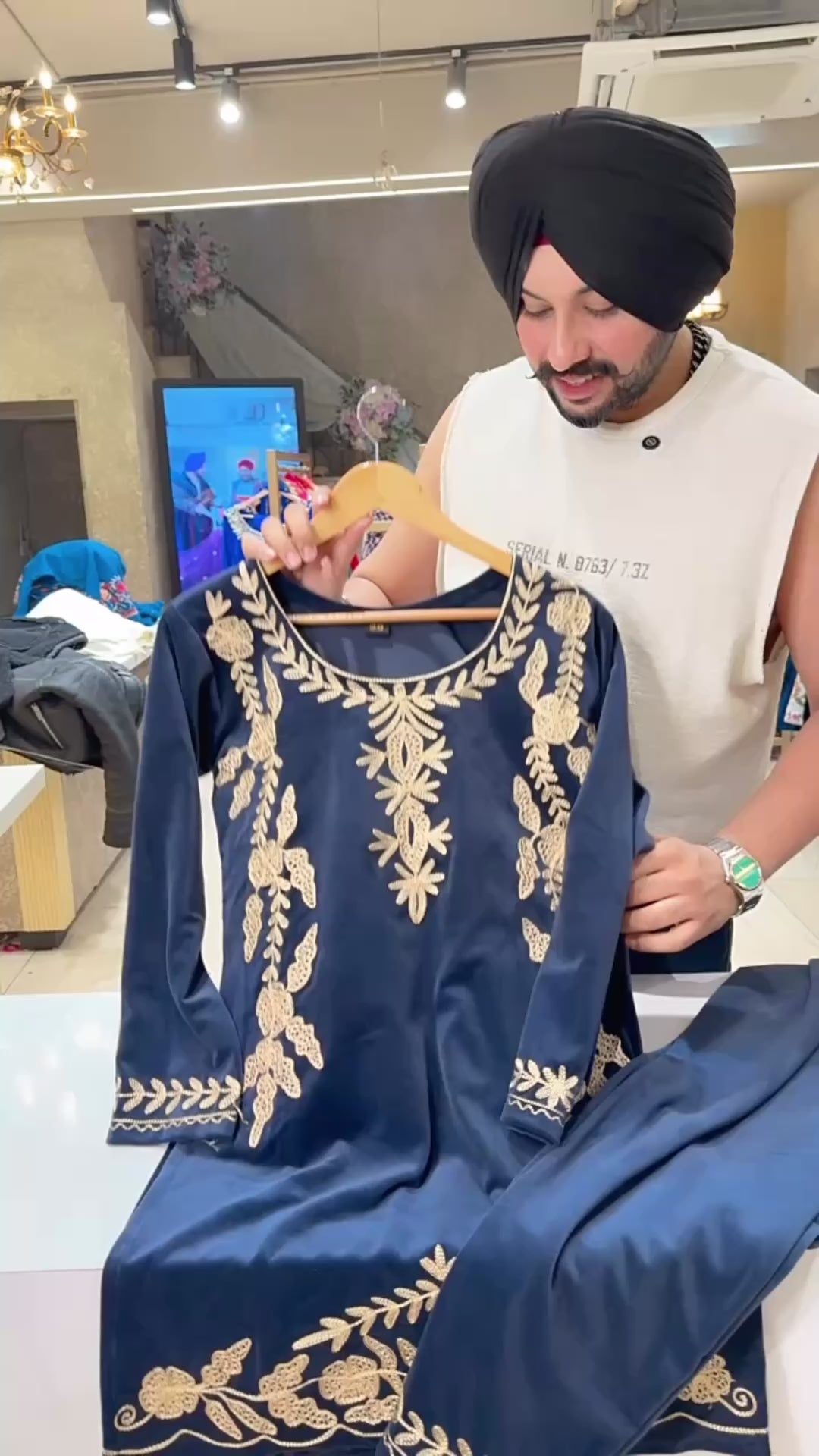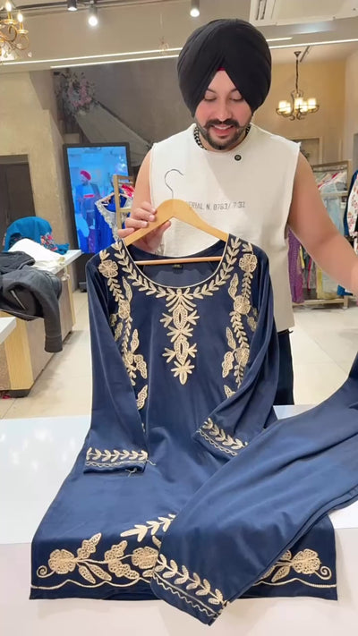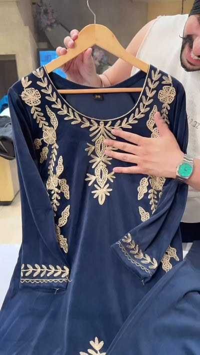 Navy Blue Matt Velvet office Wear Long length Coord set with Beautiful Embroidery Work on it