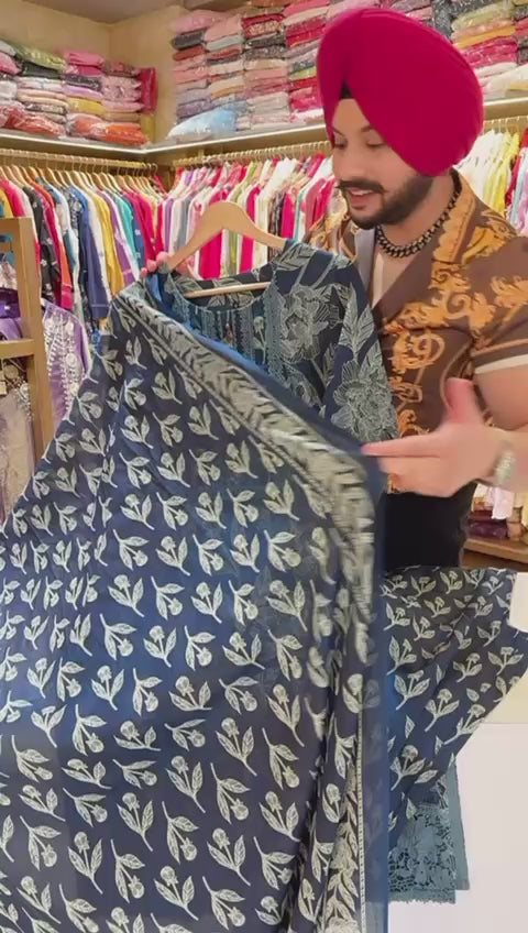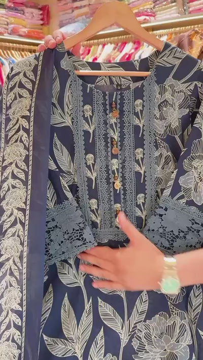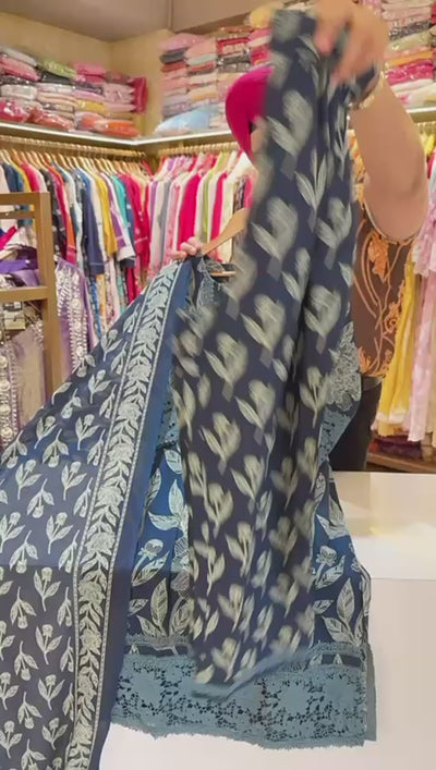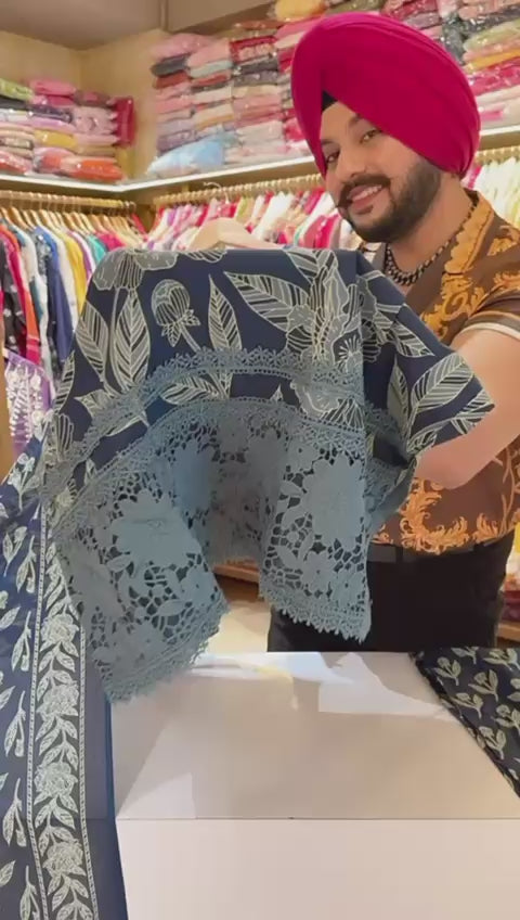 Navy Blue Pure Cotton Crochet lace Floral print Straight Suit with Beautiful Duppata