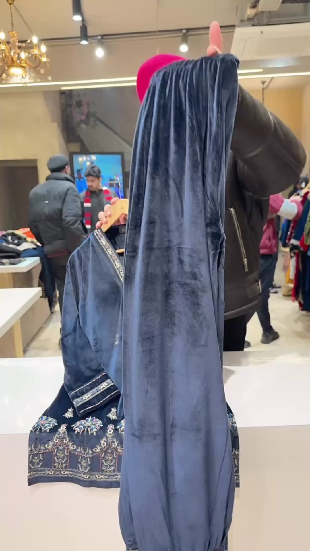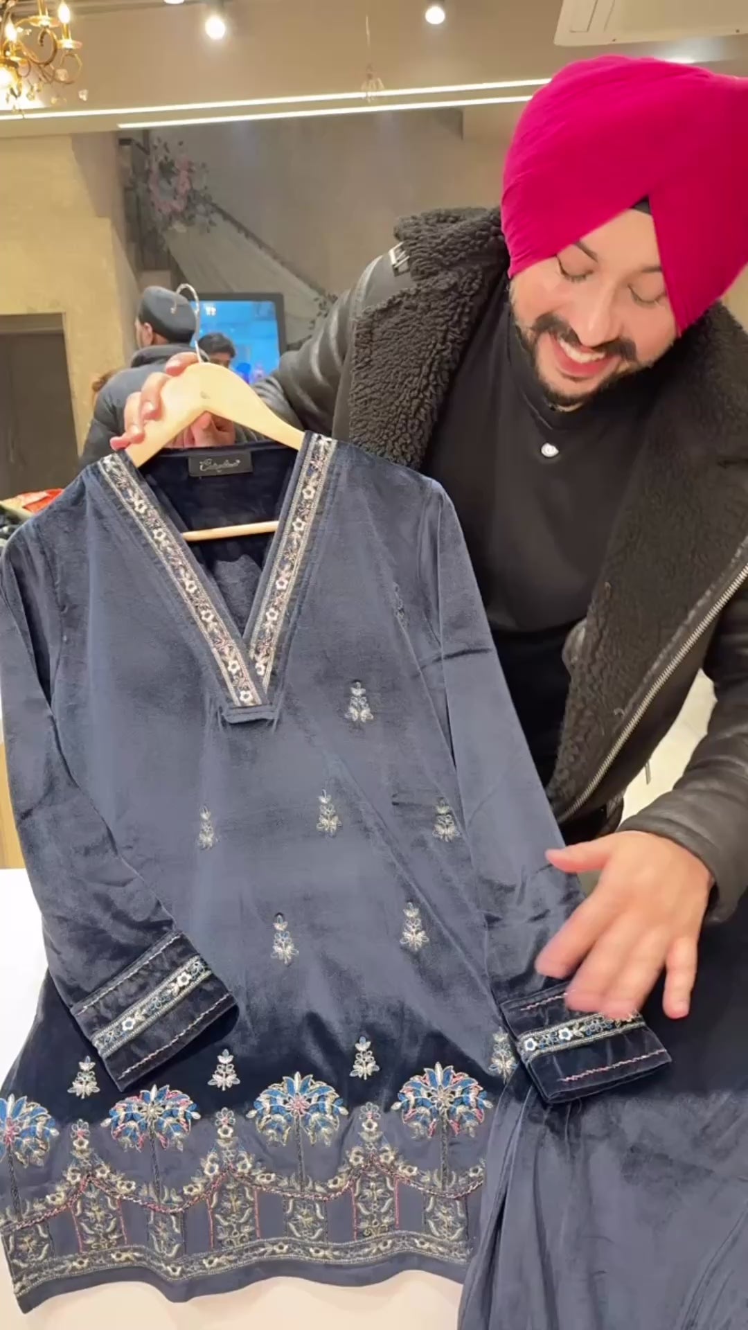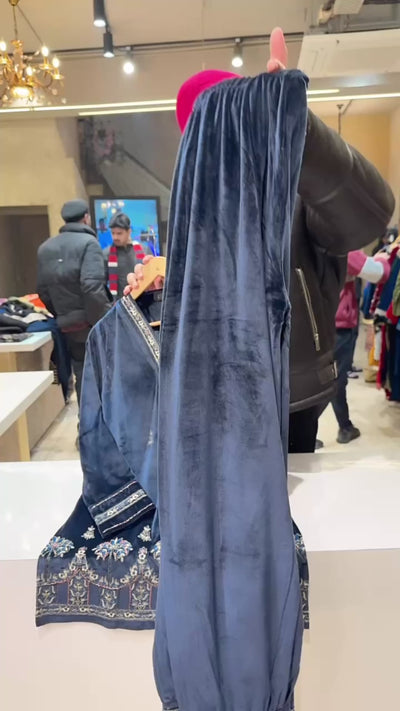 Navy Blue Strechable Velvet Hand embroidered Party Wear Coord set with Stylish Pathani Pants