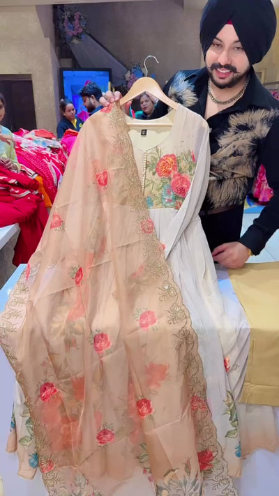 Nude Beidge Chiffon Floral Print Anarkali Suit with Beautiful Hand embroidery Work on Neck