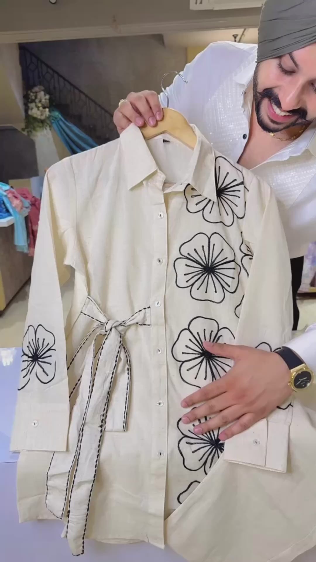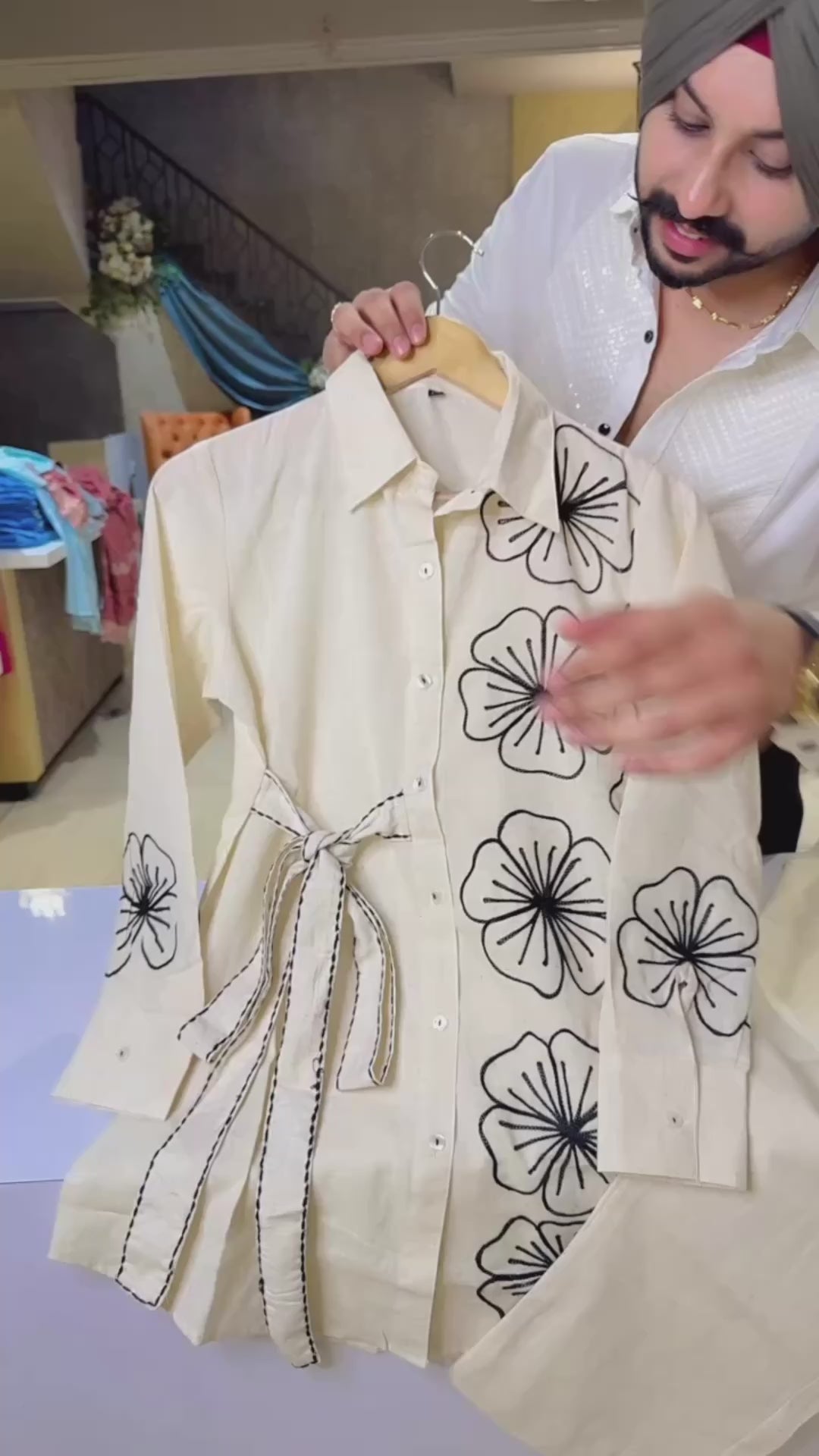Off white & Black Girlish Collar Neck Side Knot Embroidered Coord set
