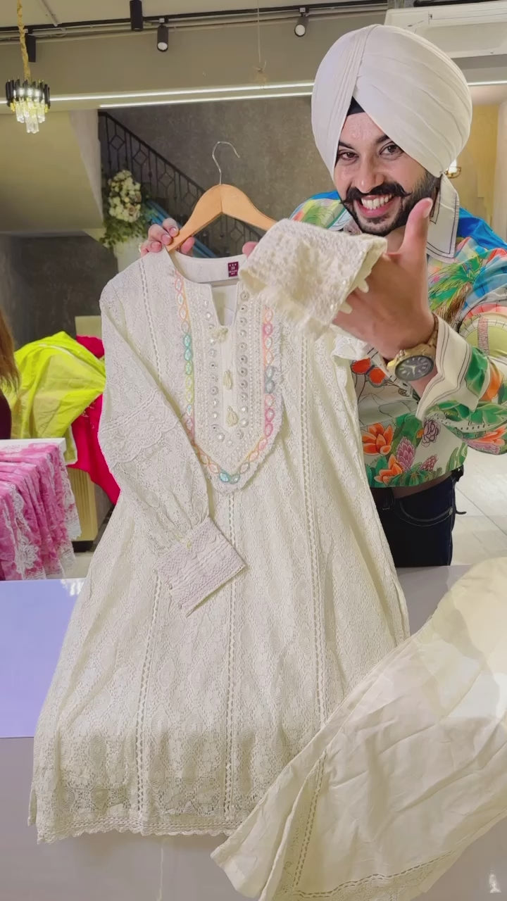 Off white Crochet lace Balloon sleeves Coord set with Beautiful Embroidery Work on neck
