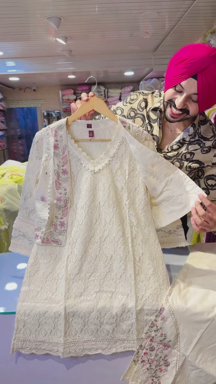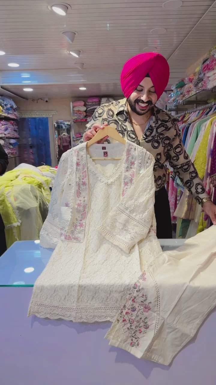Off white crochet lace Coord set with Embroidered Plazo & jacket