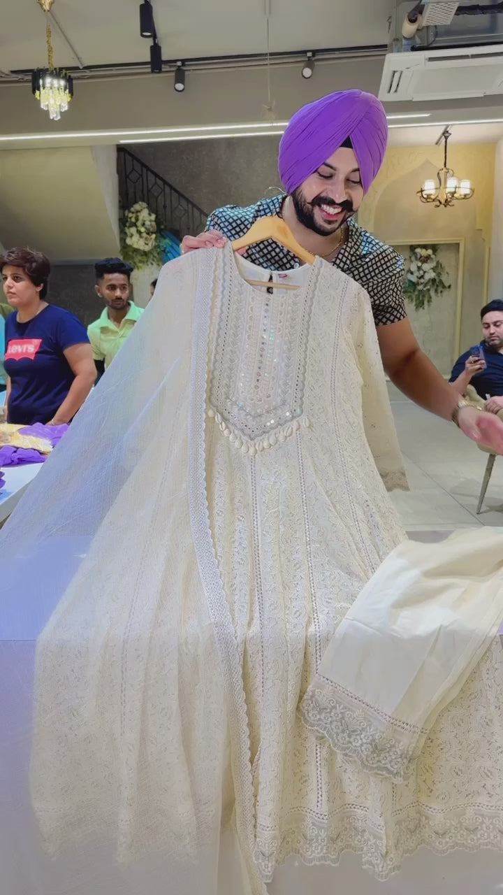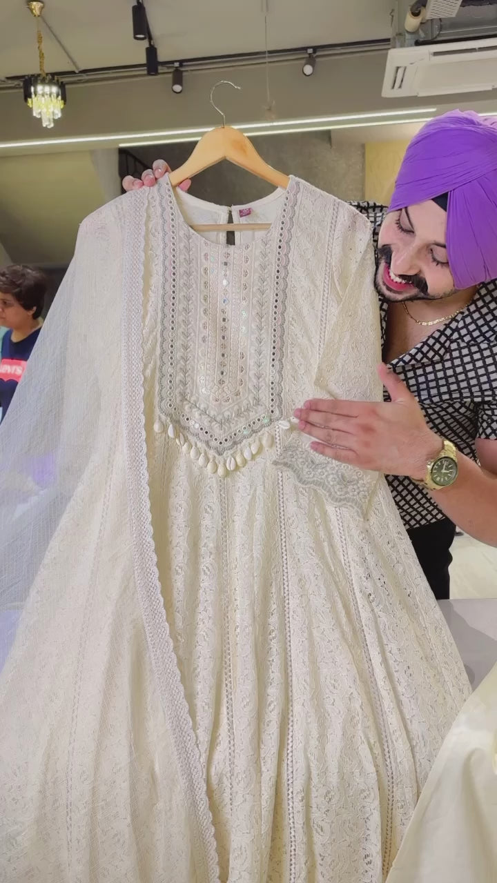 Off white Crochet Lace Embroidered Anarkali Suit with Shell hangings on neck