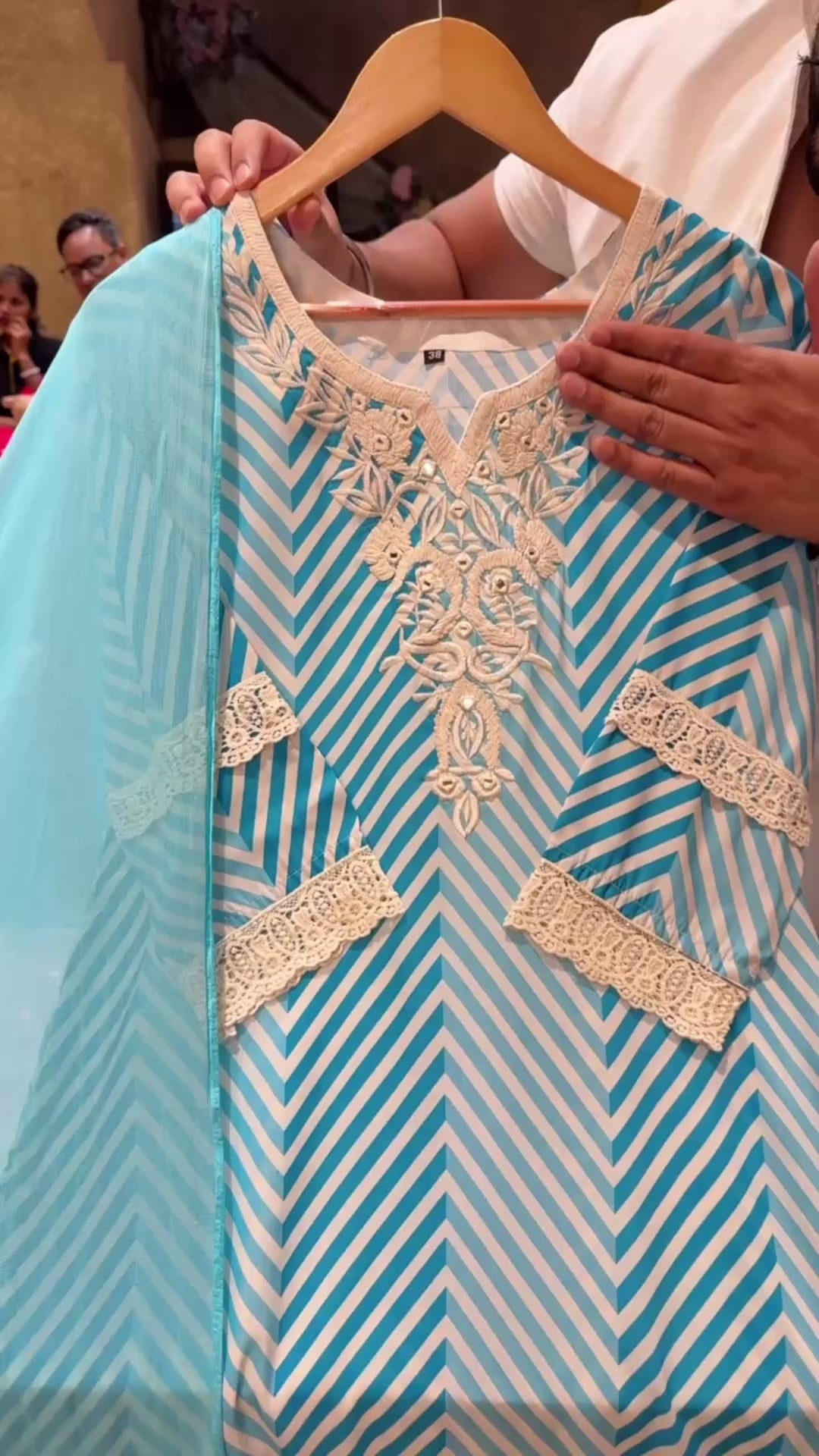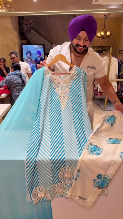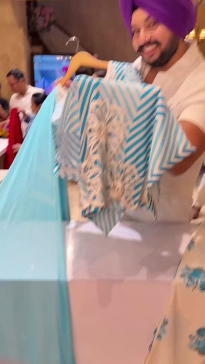 Off white & Firozi Soft Silk Embroidered & Applique Cut work Indowestern Suit