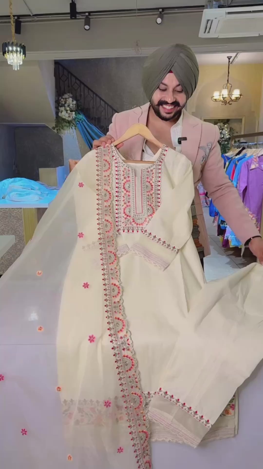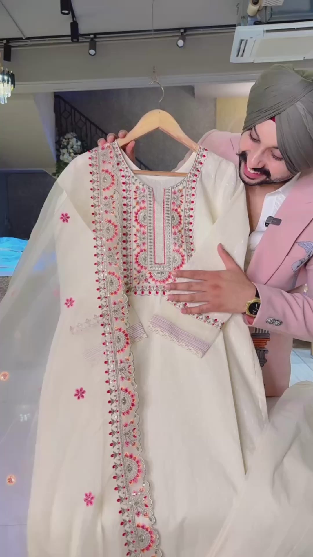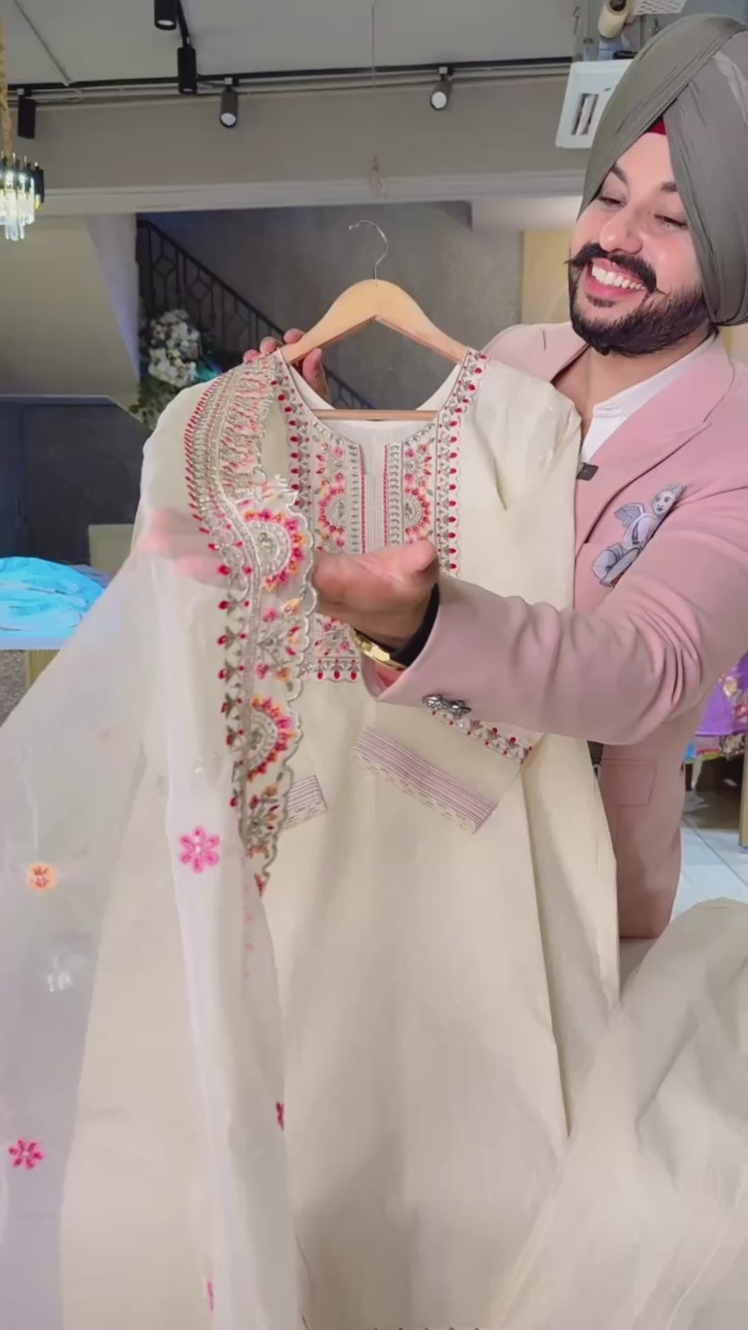 Off white Kora Cotton Heavy embroidered Pakistani Suit with Organza Embroidered Duppata